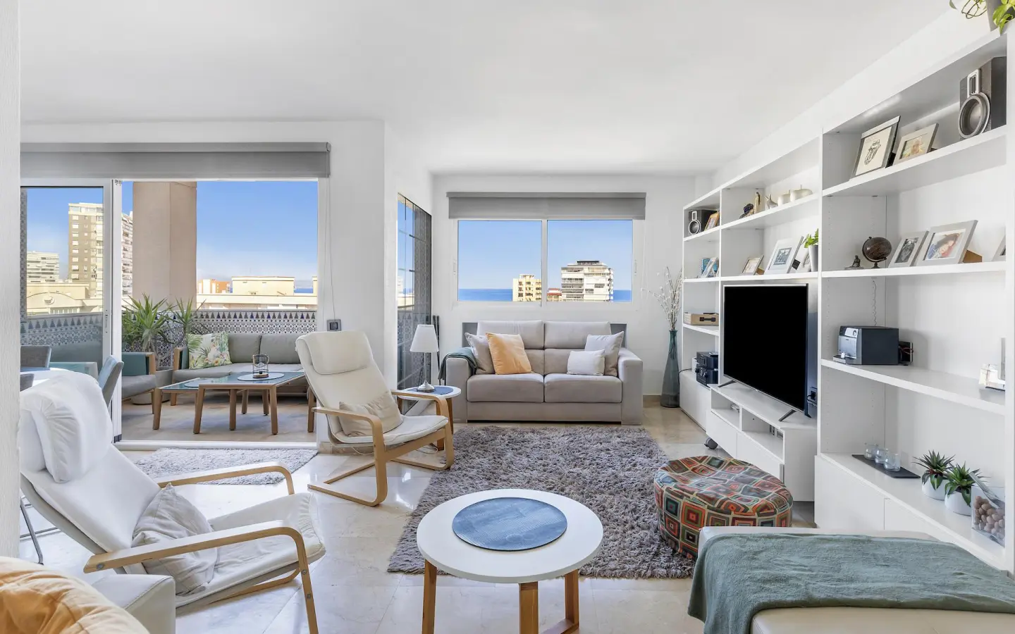 A spacious and bright living room with large windows that open onto a terrace with a beautiful view of the Mediterranean Sea. It is the perfect place to relax with your morning coffee or dinner overlooking the sea.
