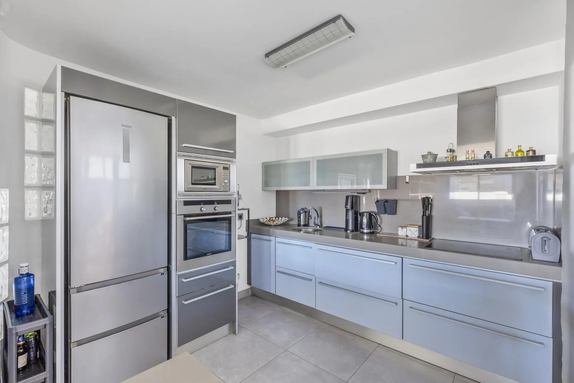 A modern, fully equipped kitchen with high-quality appliances. Next to the kitchen is a practical gallery/laundry room.