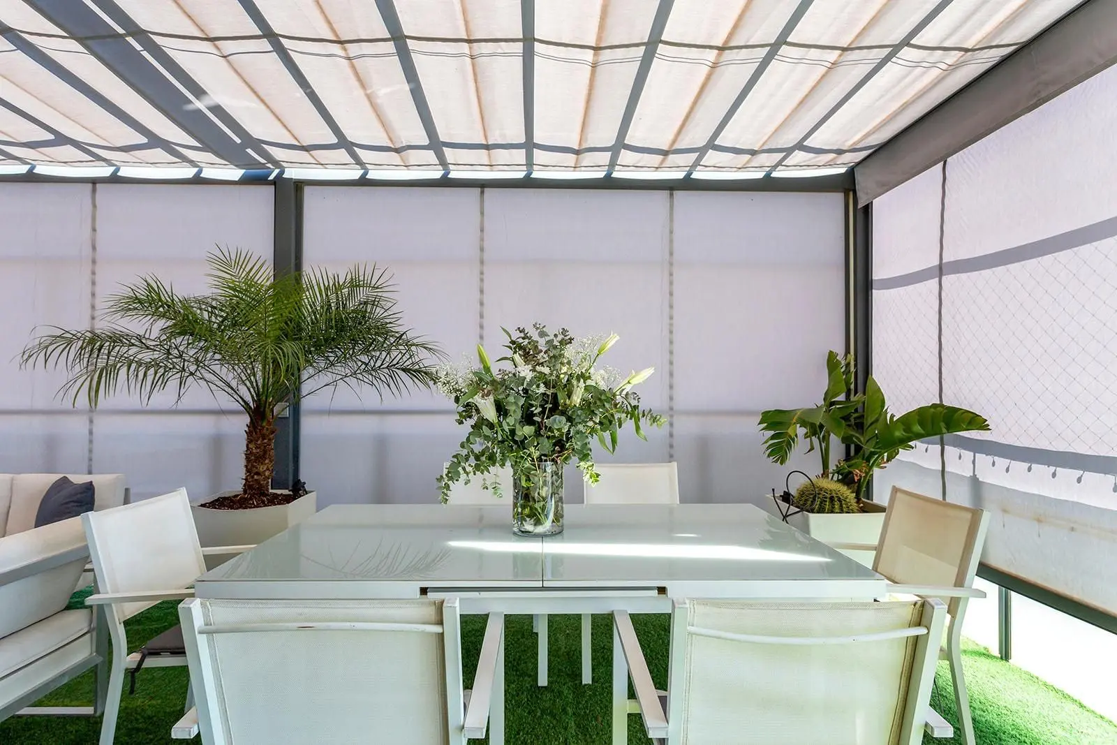 The home features 3 bedrooms and 2 full bathrooms. The master bedroom has an en-suite bathroom for privacy, while the second bathroom serves the rest of the house. The independent, fully equipped kitchen has access to a gallery with a laundry area. A large living-dining room naturally flows into the terrace. The terrace offers unobstructed views with the sea as a backdrop. It is designed for enjoyment, featuring a chill-out area, a barbecue area, a storage room, and a jacuzzi. The terrace also has fully automatic awnings.