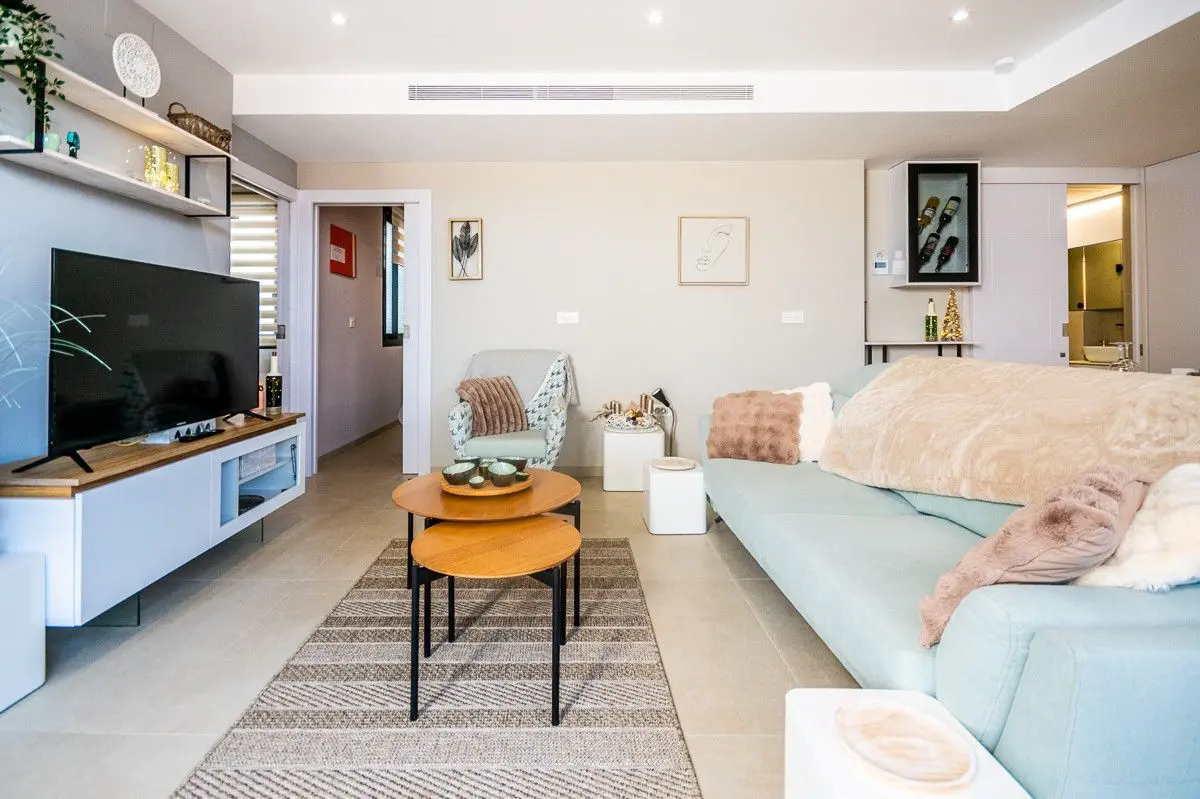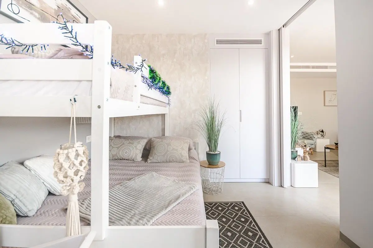 We are delighted to present this exceptionally beautiful penthouse in San Pedro del Pinatar, Murcia. This modern top-floor bungalow apartment guarantees a luxurious and carefree lifestyle. Situated in a charming coastal village and a short walk from all the essentials – such as Consum, the weekly fresh produce market, and the lively town center – you`ll enjoy an absolute prime location where comfort and convenience come together. Unique in its kind What truly sets this penthouse apart from other homes in the complex is the high-quality finish, the attention to detail, and the many exclusive extras. Moreover, this home is the only one with a private staircase to the solarium, ensuring maximum privacy and comfort. Upon entering, the open, airy layout is immediately striking. Large, fully retractable windows disappear into the wall, seamlessly blending indoors and outdoors, bathing the living space in natural light. Fly screens are fitted throughout, a major plus for everyday use. Layout and facilities The penthouse features three spacious bedrooms (sleeping up to 7, ideal for rental!) and two modern bathrooms with underfloor heating, a walk-in shower, and high-quality fixtures. All bedrooms feature built-in wardrobes, TV connections, and shutters for added comfort and privacy. The kitchen was designed completely differently from the standard layouts in the complex: a kitchen island that extends into a dining table, high-quality equipment (dishwasher, hob, refrigerator, oven, microwave, extractor hood, wine cabinet), ample storage space thanks to custom-made cabinets. The house is fully air-conditioned, both in the living area and in the bedrooms. Private solarium – your own luxury oasis The spacious 84 m2 solarium is accessed privately via your own staircase, completely hidden from view from the neighbors. Here you will find: a fully equipped outdoor kitchen with refrigerator, hob, grill plate and automatic roller shutter, built-in sun blinds with integrated LED spotlights, built-in music boxes in the wall, preparation for connecting a jacuzzi, panoramic view of a green park that may never be built on, which guarantees lasting privacy. Additional assets Toldo placed on the small terrace Communal swimming pool (heatable) Spacious separate storage room with boiler, washing machine/dryer connection and extra guest toilet Parking space included Only 2 years old → benefit from only 8% tax instead of 10% Complex of only approximately 22 apartments No view, quiet location Optional furniture The house can be purchased fully furnished and bicycle storage is also optional. Are you looking for a move-in ready holiday home, a comfortable permanent residence, or an excellent investment opportunity with strong rental potential? Then this penthouse is the perfect choice. Plan your visit today and discover for yourself all the luxury this home has to offer.