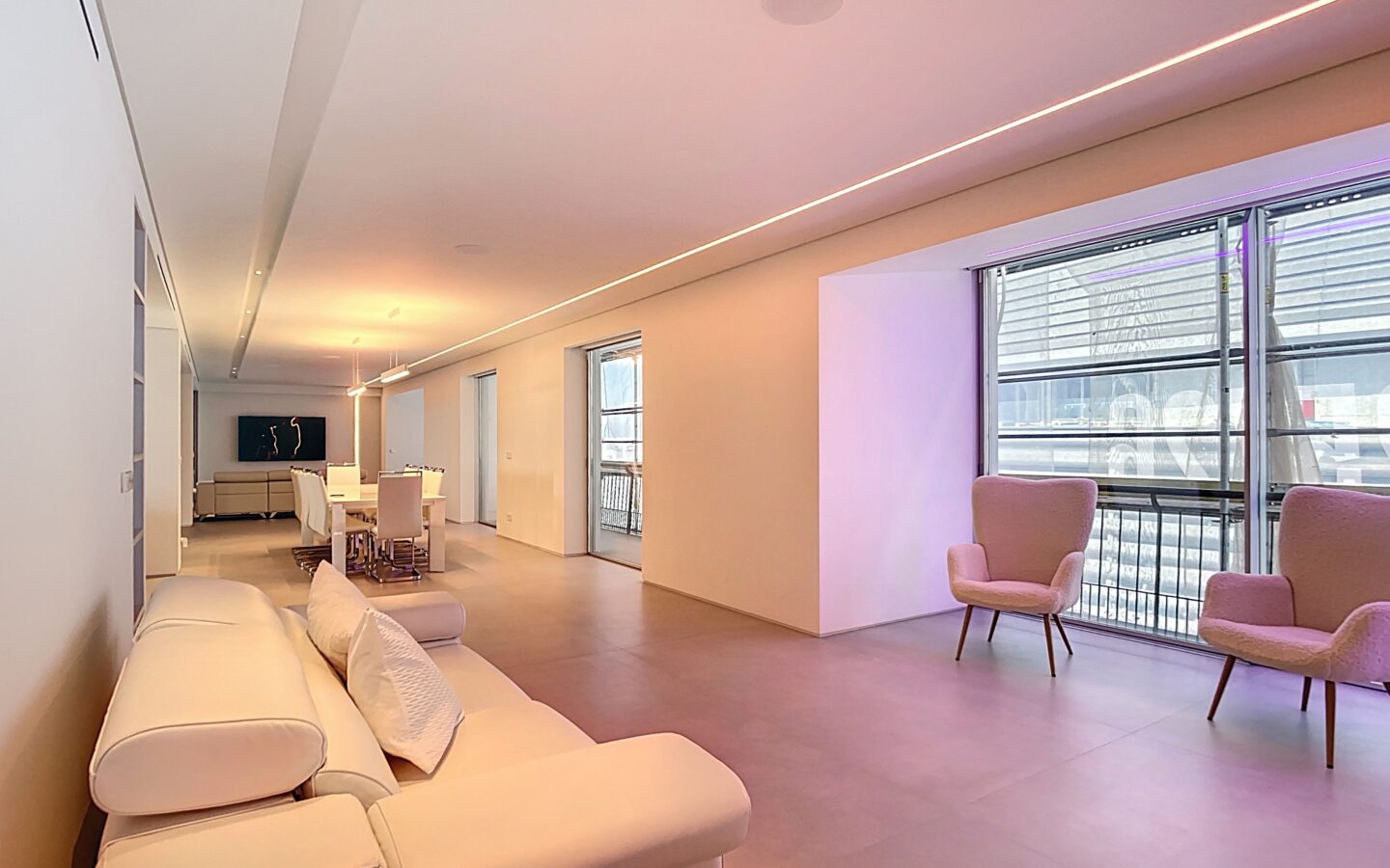 Upon entering, the home reveals a balance of light, space, and modernity. Floor-to-ceiling windows draw in Madrid’s sunlight, illuminating a generous living and dining area framed by a sculptural staircase. Clean lines, polished flooring, and ambient LED lighting comprise an atmosphere where every detail has been thoroughly considered. The kitchen features integrated appliances, discreetly hidden behind seamless paneling, emphasizing both function and form. A home automation system enhances the living experience, allowing users to manage lighting, climate, and sound effortlessly.