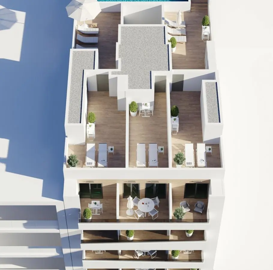 Discover these brand new apartments and penthouses in one of the most sought-after areas of Torrevieja, just 600 metres from Playa del Cura beach and 300 metres from the seafront promenade. Located in the city centre, this lively neighbourhood offers all essential amenities within walking distance, including supermarkets, shops, restaurants, cafés and public transport. Torrevieja is a well-known coastal town on the Costa Blanca, famous for its mild Mediterranean climate, lively atmosphere and year-round seaside lifestyle.