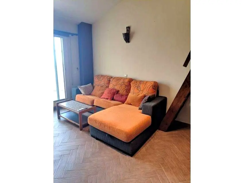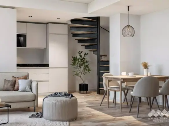 This attic includes a fully equipped kitchen, which connects seamlessly to a laundry area and an independent storage room. The living space features a two-level living-dining area, designed with functionality in mind. An elegant staircase leads to an elevated room, suitable for a home office, reading nook, or an additional bedroom.