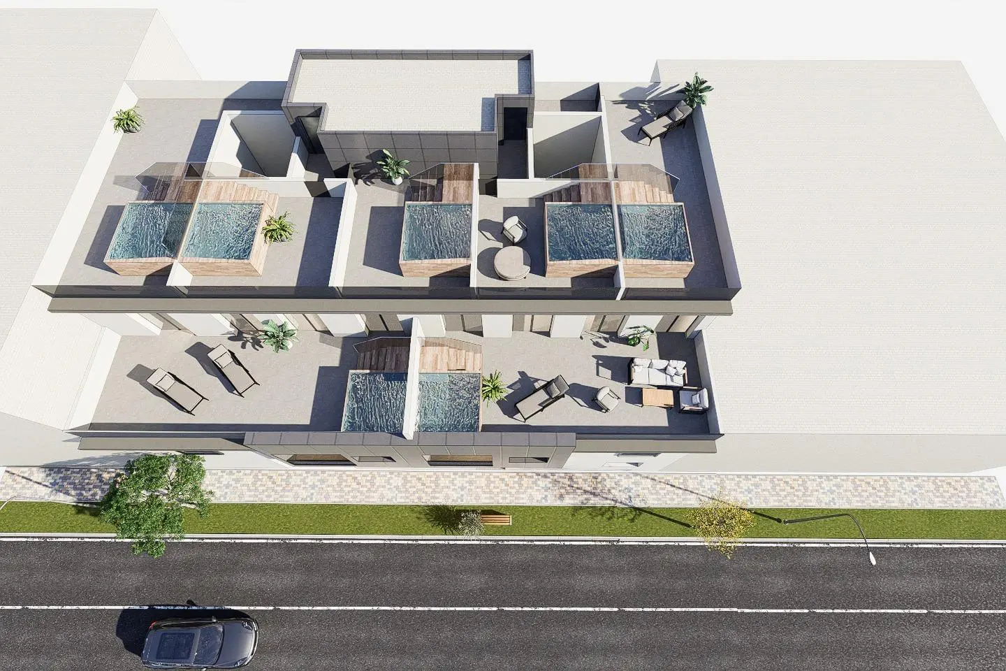 - Ground Floor: A spacious 3-bedroom apartment with its very own private rooftop solarium, perfect for sunbathing with a view.