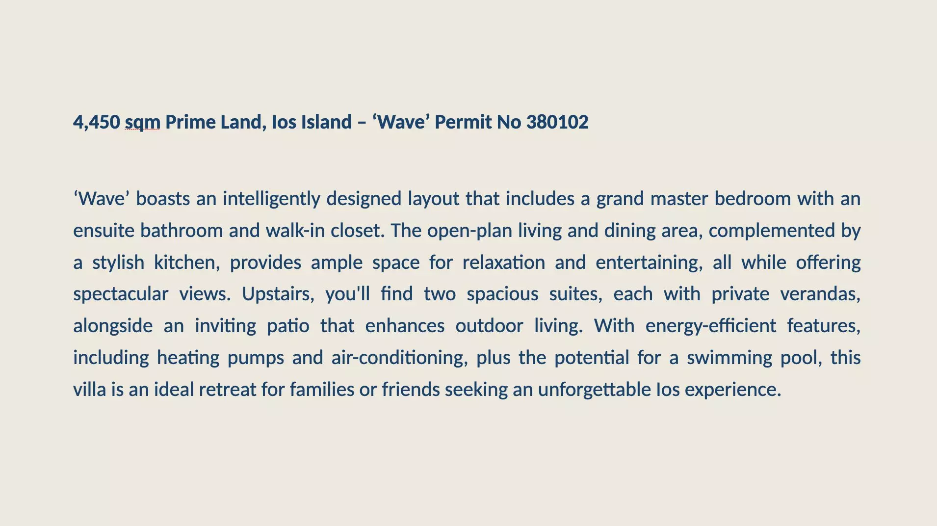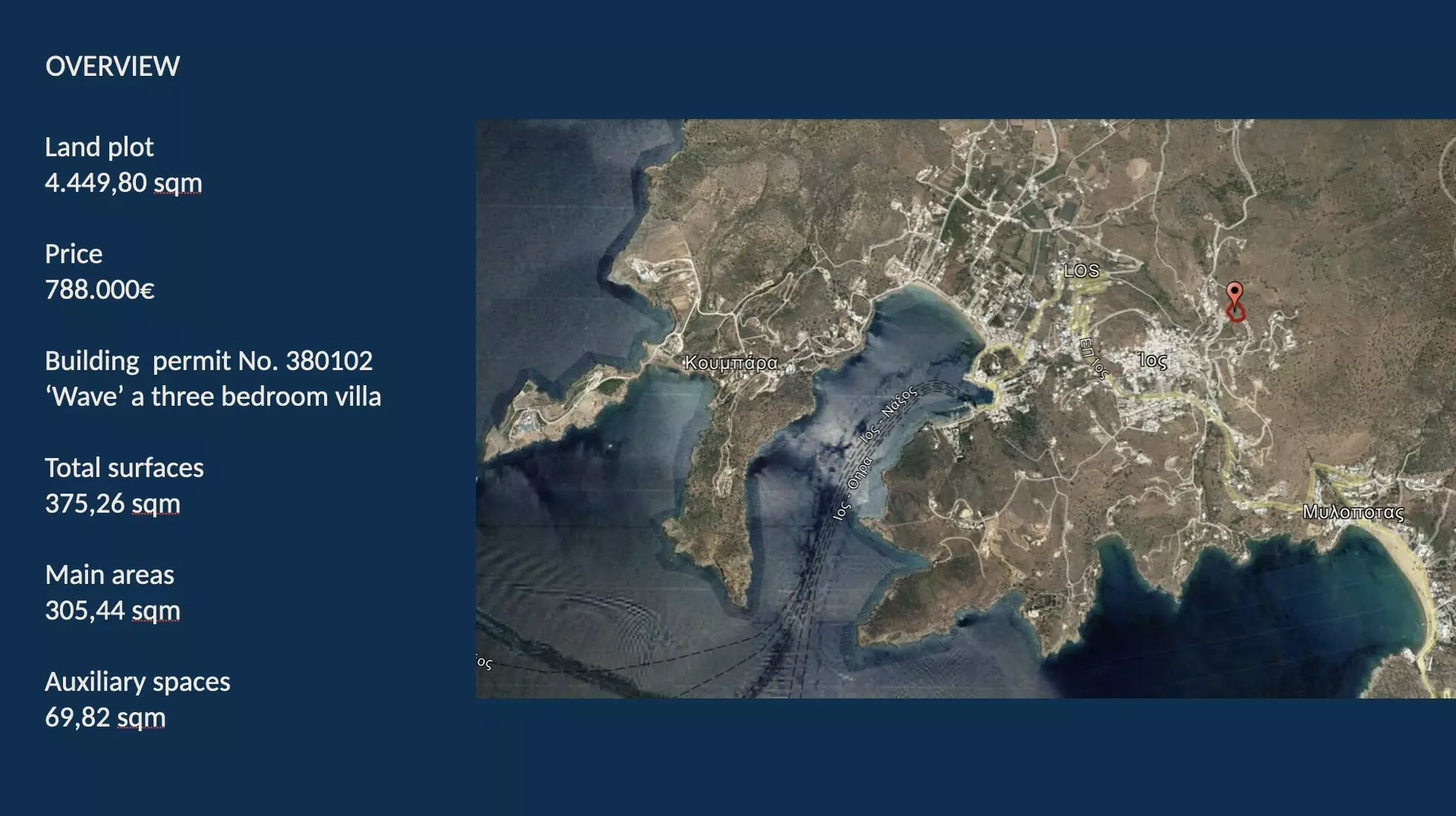 With spectacular views next to the iconic village of Ios, this prime plot of land offers a unique opportunity to own a magnificent three-bedroom villa ‘Wave’ set on a generous 4.449,80 sqm plot. With breathtaking views of the village and sea, this property comes with a building permit for a spacious 375,26 sqm home, designed for both luxury and comfort. Enjoy the perfect blend of modern living and natural beauty, a short walk away from the vibrant village and with direct road access to the most beautiful beaches. The property is privately held and immediately transferable. Complete legal and technical documentation is available, including land registry certificates, topographic surveys, forestry clearance, and preliminary architectural studies. Click into photos for a full presentation…