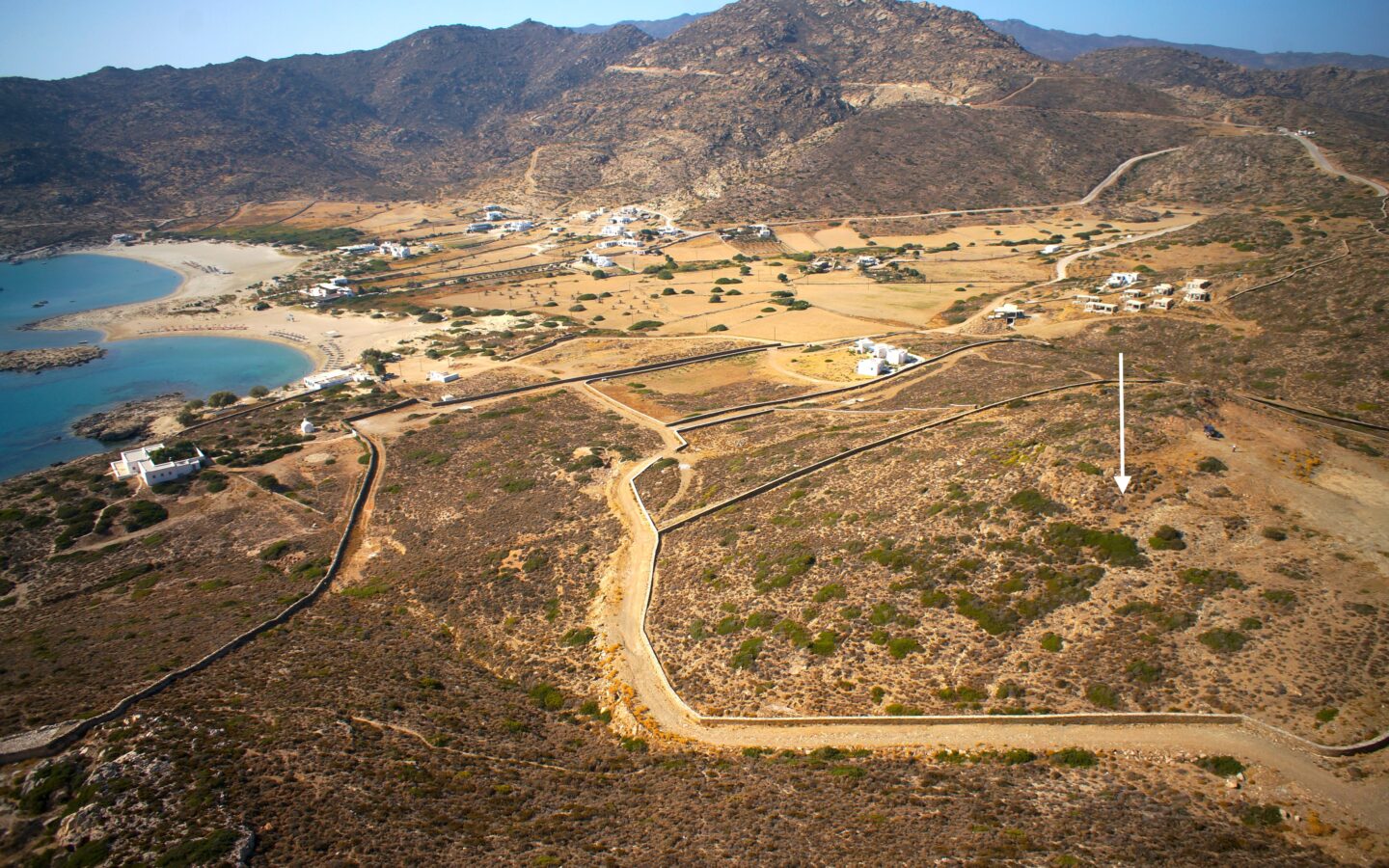 On the beautiful Cycladic island of Ios, this plot is well located on the top of a hill with spectacular views to the famous Magganari beach.