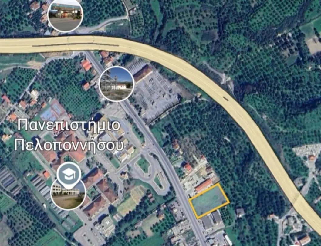 The property features frontage on the Athens–Kalamata National Road, at a highly strategic location opposite the University of the Peloponnese, ensuring immediate accessibility, high visibility, and strong commercial potential.