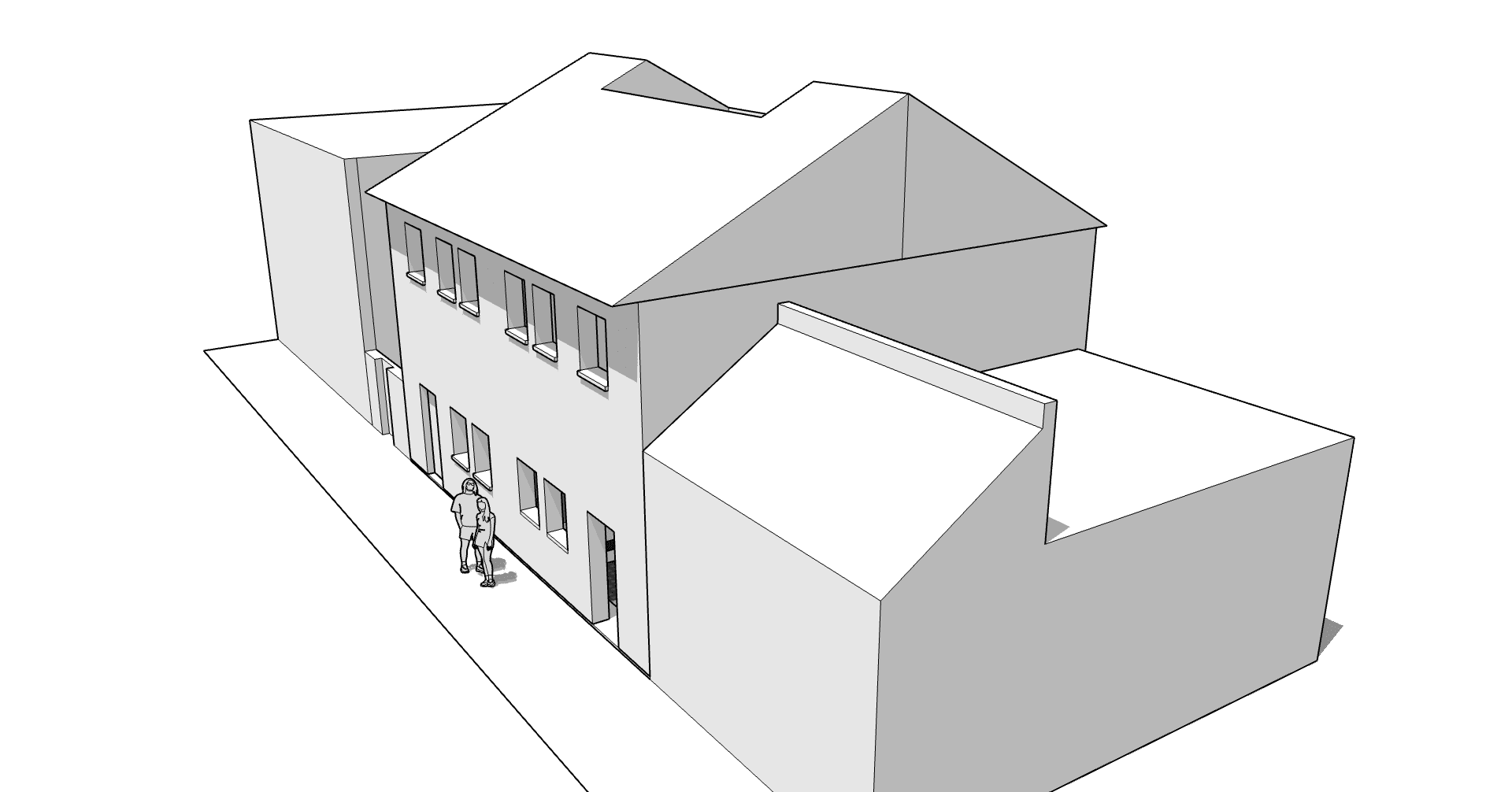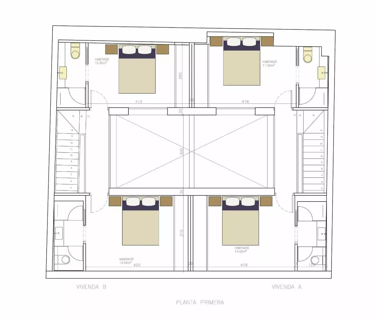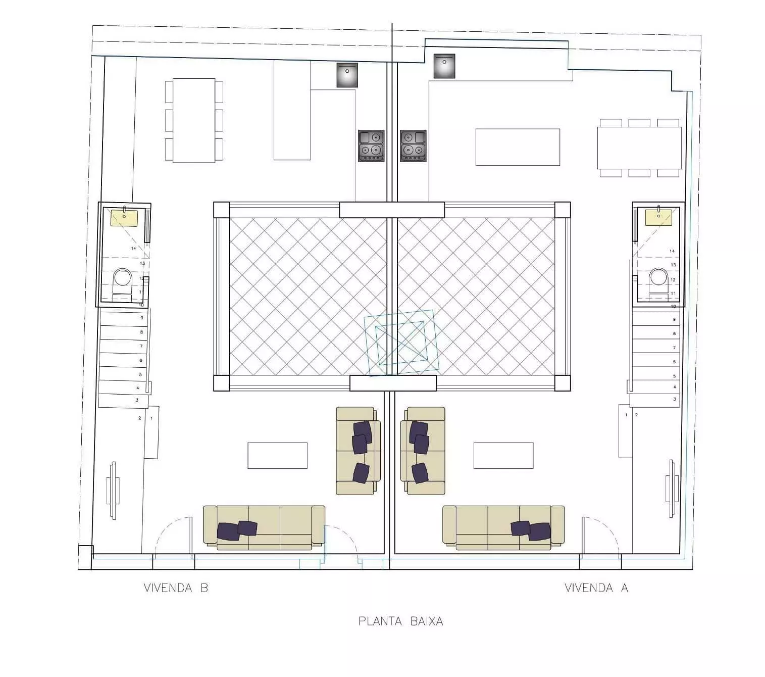 This plot allows for flexible building options. You can construct a single house of up to 189m2, with the possibility of two floors, or opt for two separate homes of 94m2, with 47m2 on each floor. The plans available suggest two houses, each featuring two bedrooms equipped with en suite shower rooms, along with a guest toilet located on the ground floor. The design includes a lounge and kitchen that surrounds an interior patio, optimizing the use of space.