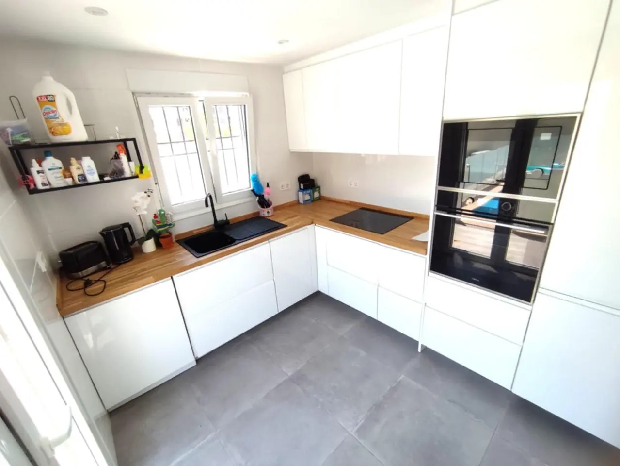 On the ground floor, there is a shower room that is fully tiled in a modern marble finish. The upstairs bathroom also follows this design, ensuring consistency throughout the property. Both bedrooms come with air conditioning and fitted wardrobes. Notably, the master bedroom has direct access to a sun balcony that overlooks the swimming pool, providing a private outdoor space.