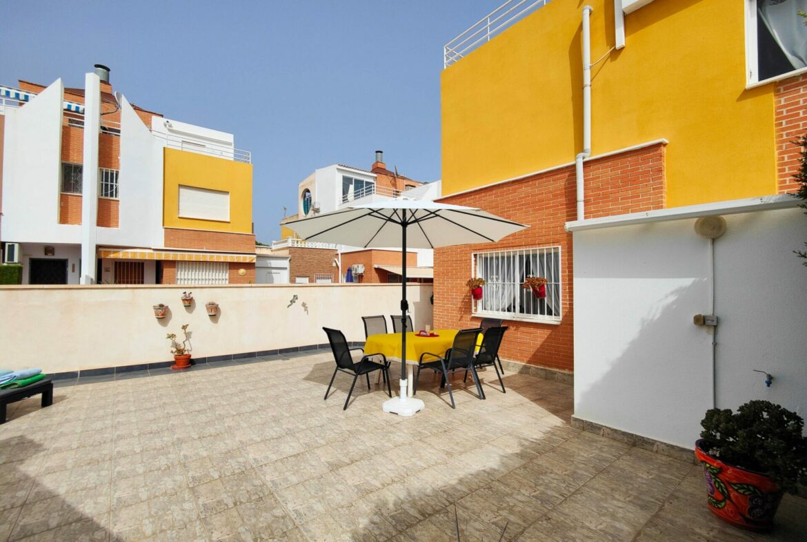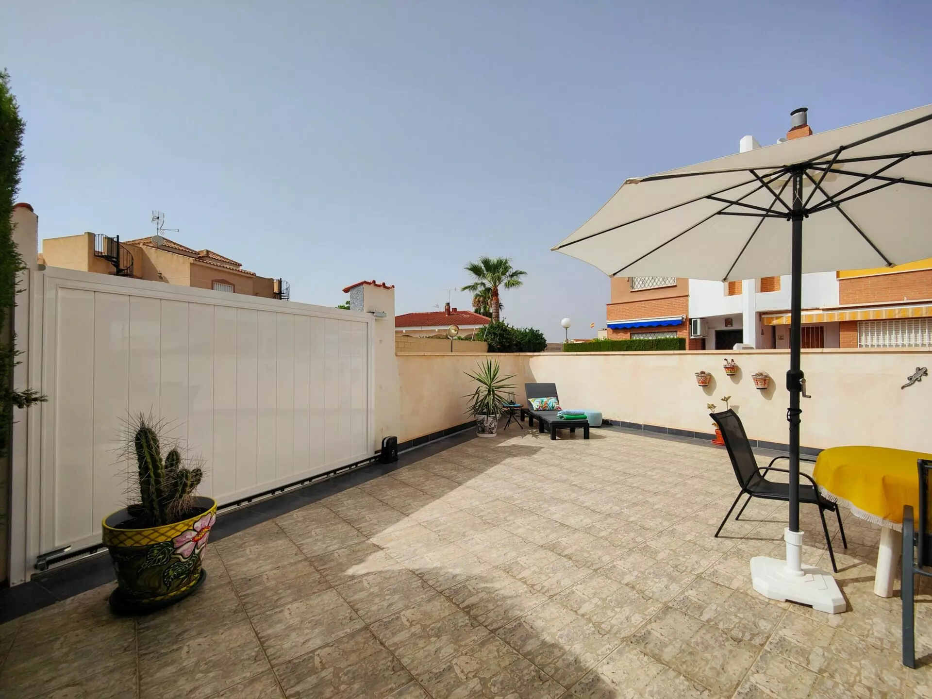 This corner quad house in El Mirador de Los Altos, Orihuela Costa, is listed for sale. Located in a well-established residential area, the property features a communal pool surrounded by landscaped gardens.