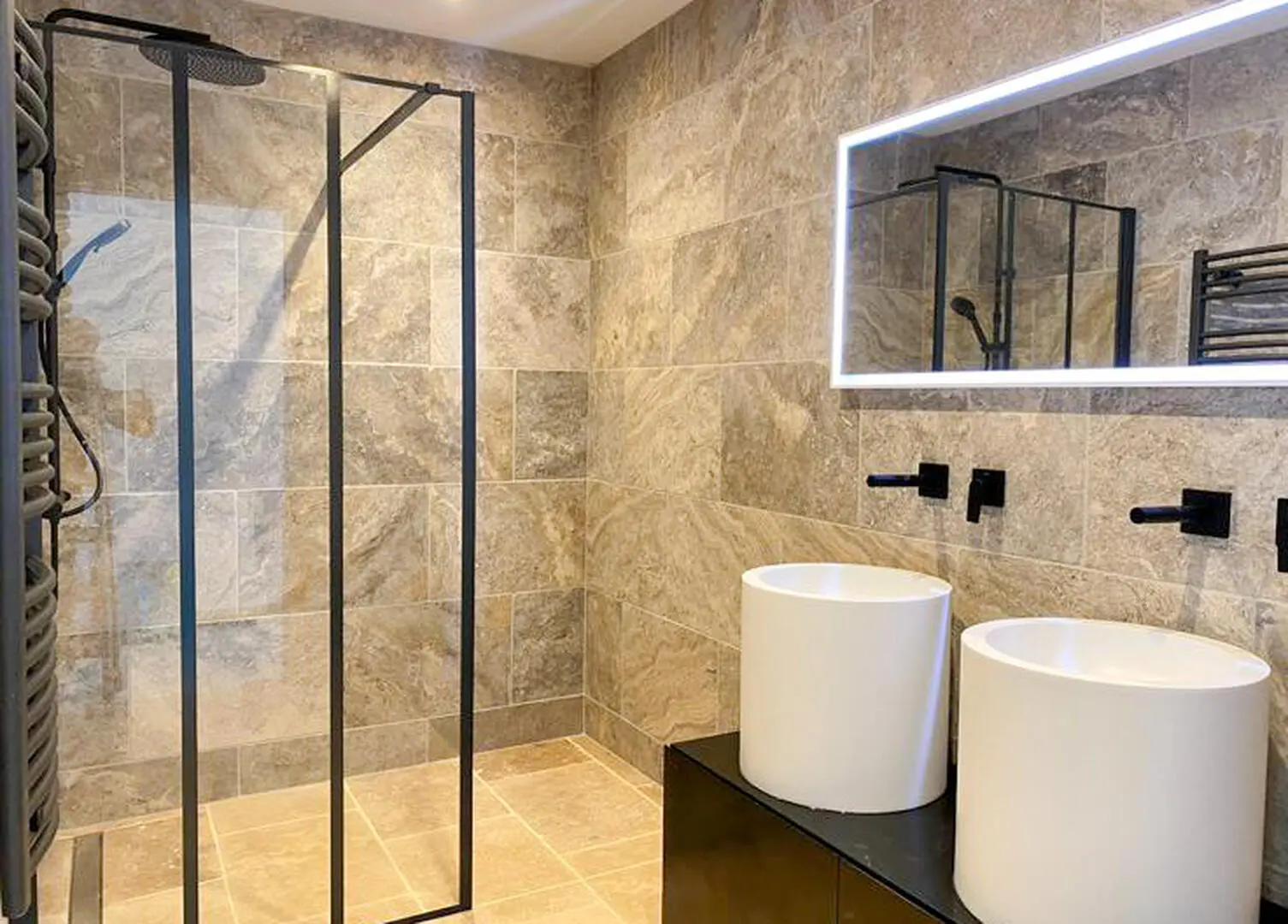 A welcoming entrance hall leads to a bright and spacious open-plan living area with a modern fitted kitchen and elegant travertine stone flooring throughout. This level also includes: