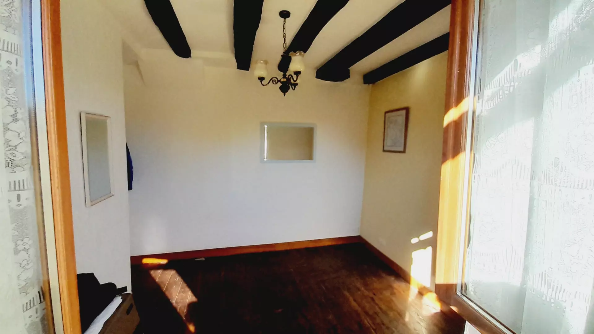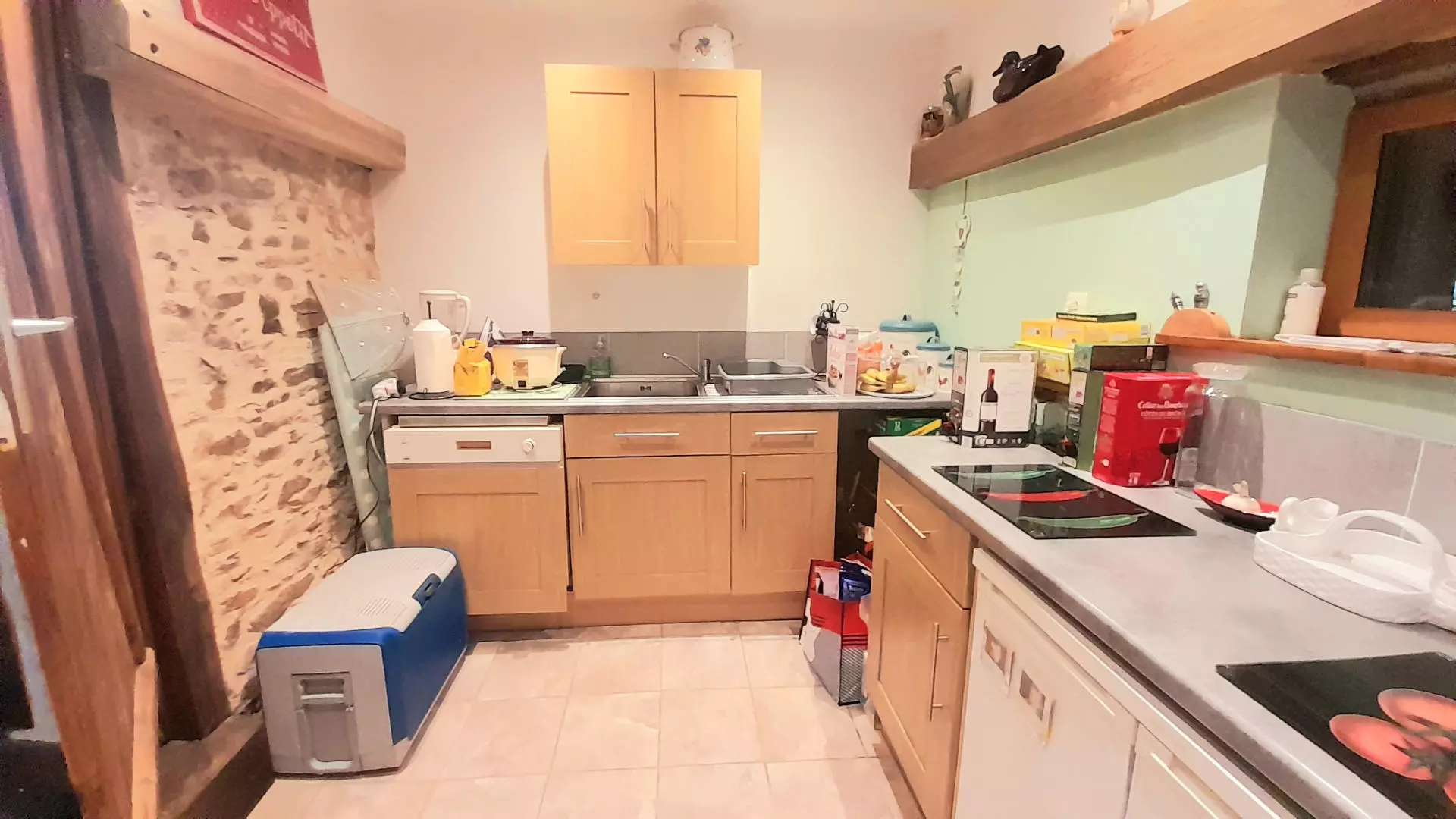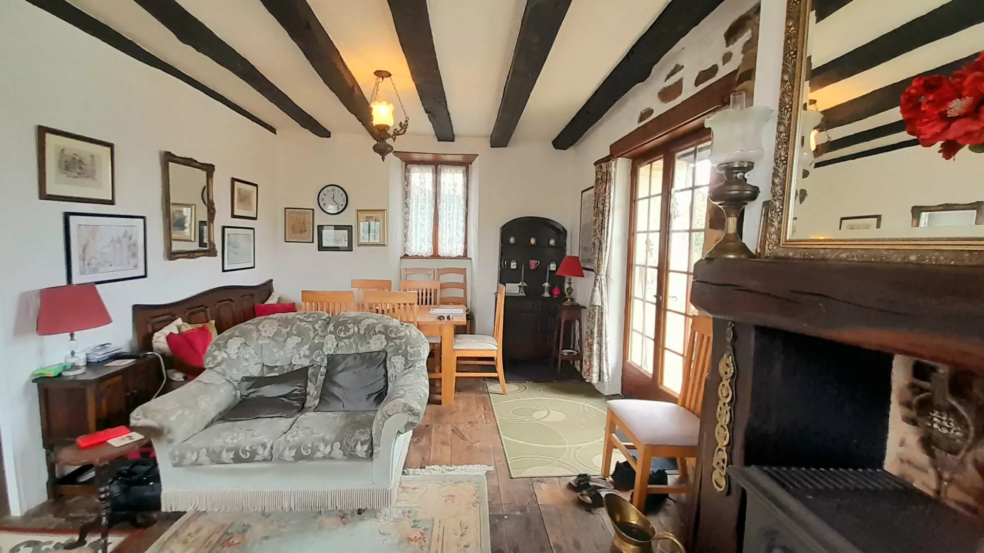 The house features an open-plan living space that flows seamlessly into the garden through patio doors. This design encourages natural light, allowing the living and dining areas to feel connected to nature. Decorative elements include beamed ceilings and wooden floors, while a fireplace with a wood-burning stove adds practicality. The property is double glazed, enhancing energy efficiency and comfort.