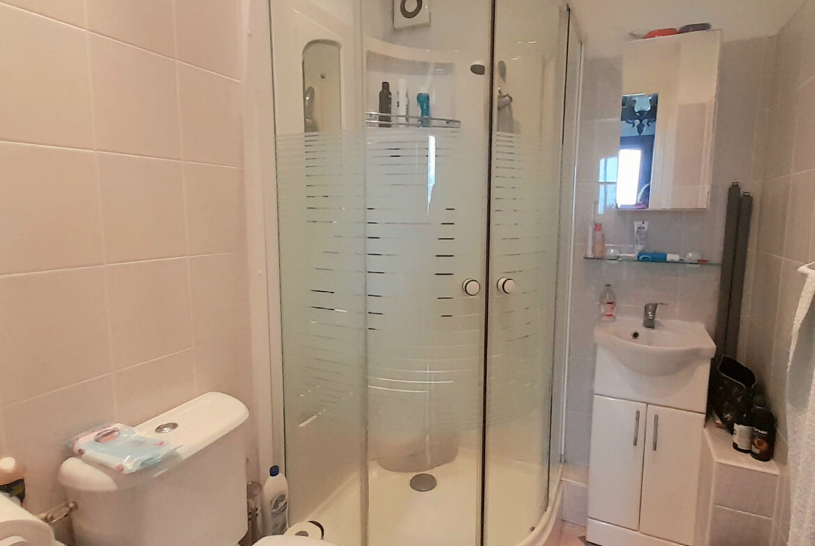 The kitchen is situated on the opposite side of the living room, maintaining an open connection while also offering its own distinct space. A staircase leads to the first floor, allowing easy access to the upper levels. The layout includes a downstairs double bedroom, which could double as a dining room, along with a shower room conveniently located off the living area. At the back of the kitchen, you’ll find a utility room that provides additional storage and functionality, as well as direct access to the adjoining barn.