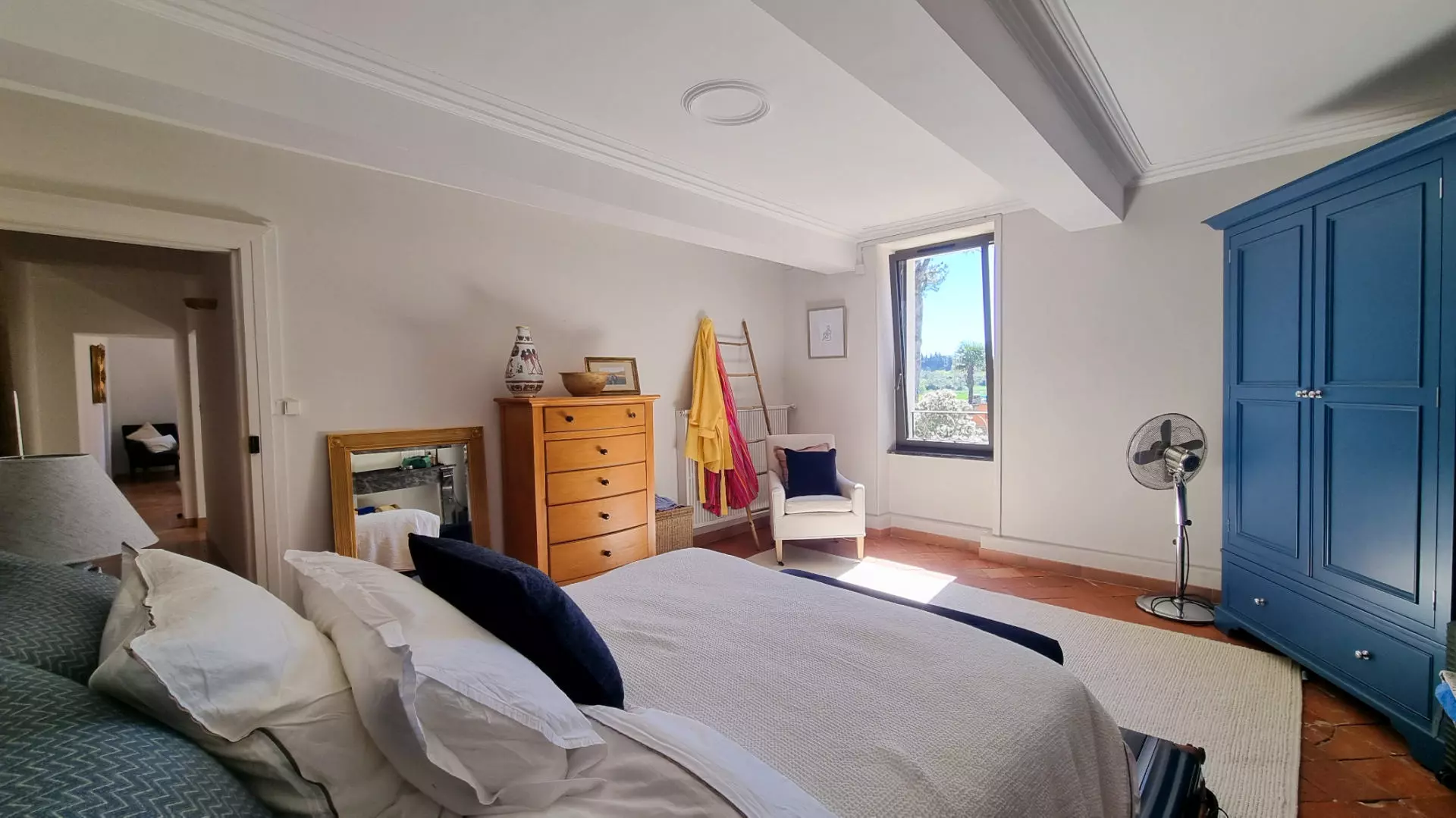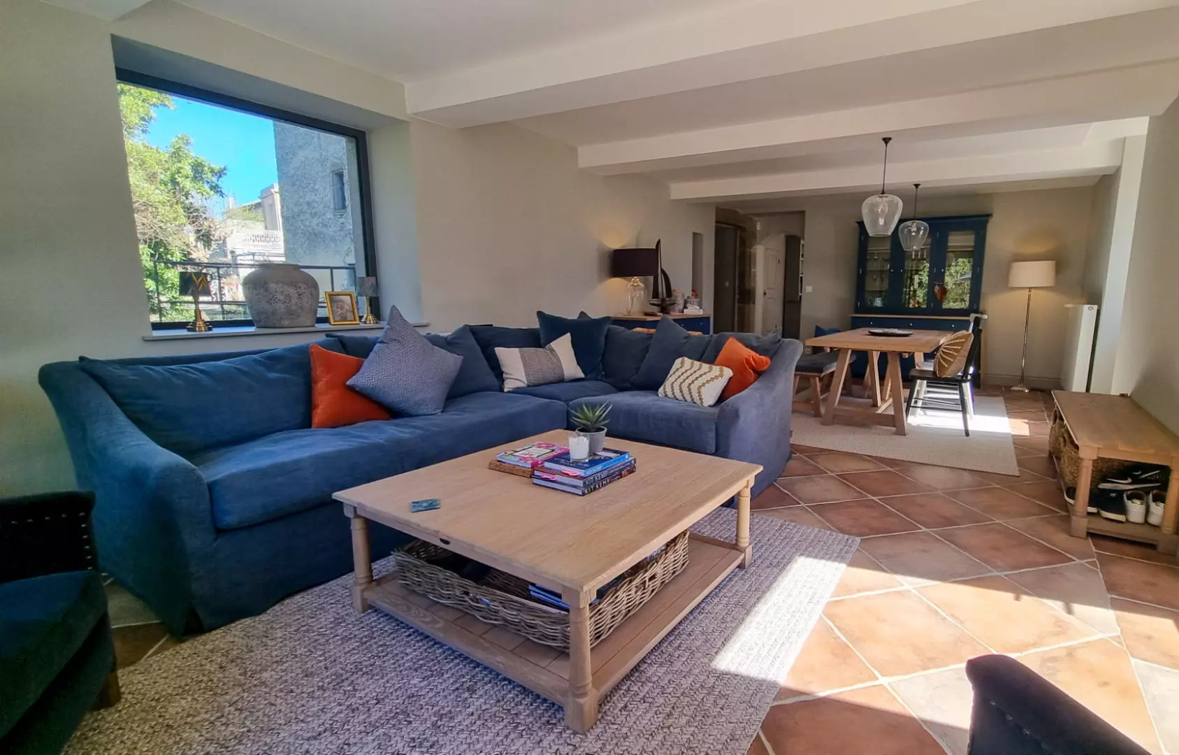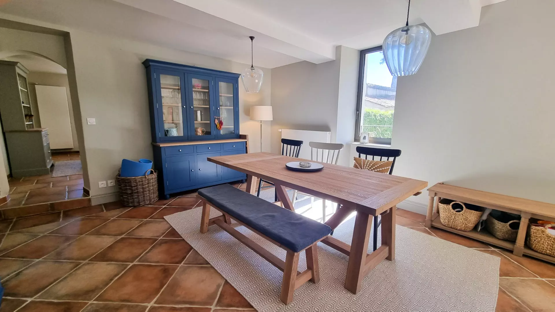 Upon entering through the front door, you find a living room that is filled with light. The room features sliding glass doors that open directly onto the terrace, providing views down the river. Adjacent to the living room is a separate breakfast room that leads to a modern, fully-equipped kitchen. The kitchen also includes bespoke glazed doors that access the front terrace.