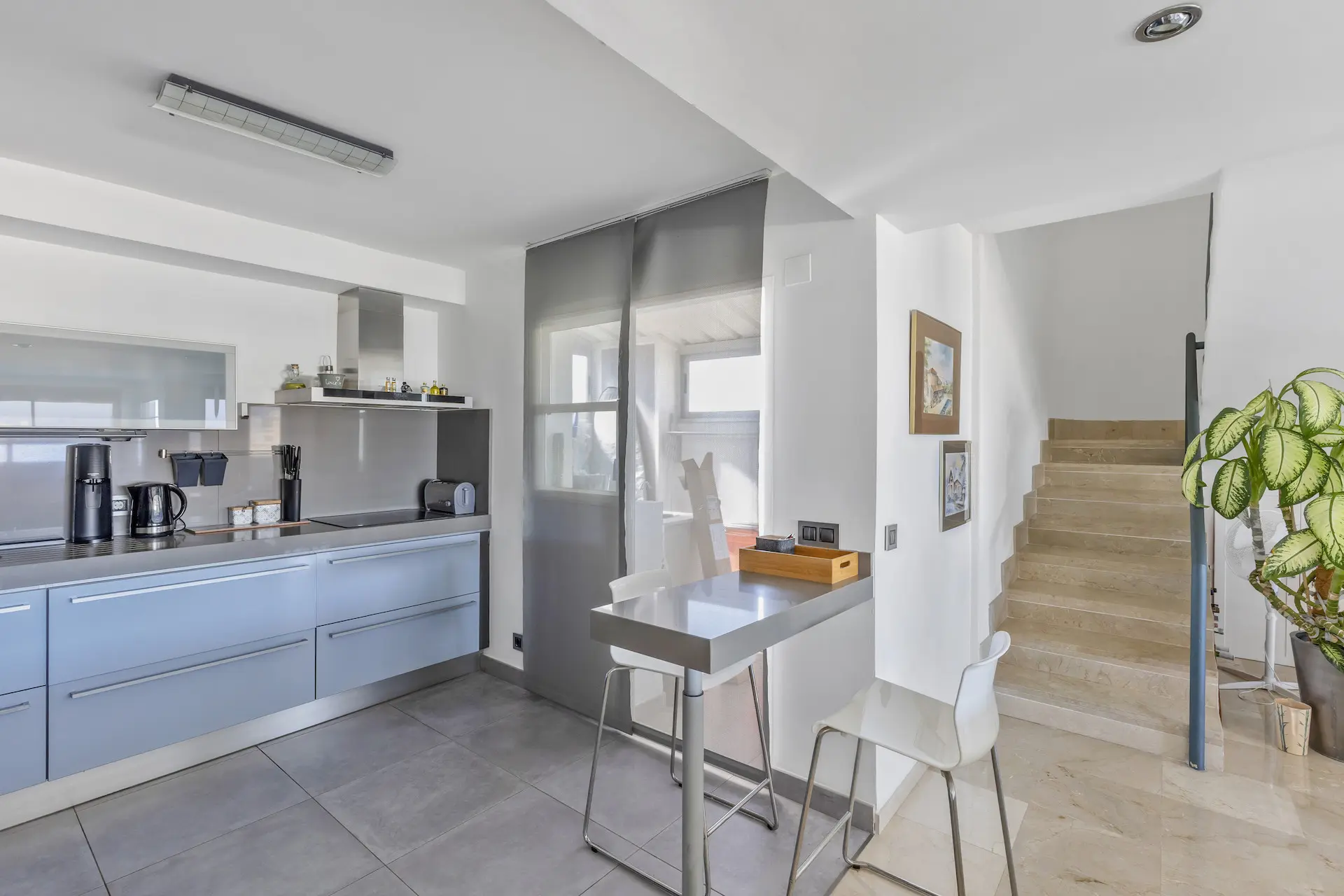 On the second level, the penthouse includes three bedrooms featuring bright decor and large windows that ensure the interiors are filled with sunlight. Each bedroom comes with its unique view of either the sea or the mountains, adding a distinctive touch to the living experience. The apartment contains two modern bathrooms, with one located on the lower level and another near the bedrooms on the upper level, suitable for privacy and convenience.