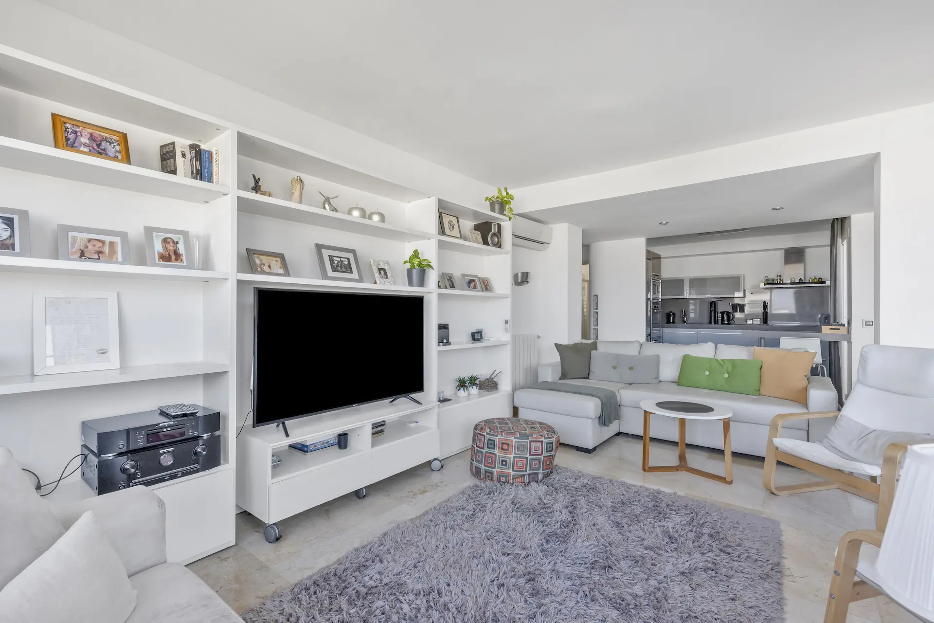 The terrace provides picturesque views of the sea, offering a pleasant spot for relaxation during mornings or evenings. The spacious living room with large windows opens to this terrace, allowing easy access to outdoor views while enjoying your coffee or dinner.