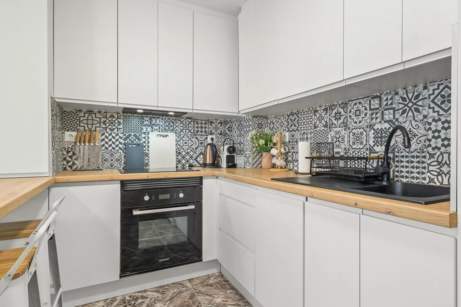 The apartment features an open-plan kitchen and lounge area. This layout is designed for those who appreciate cooking and socializing in one bright space. It also comes with an air conditioner in the living area, ensuring comfort throughout the year. A small private balcony extends from the living space, providing an area to enjoy a morning coffee or unwind in the evening.