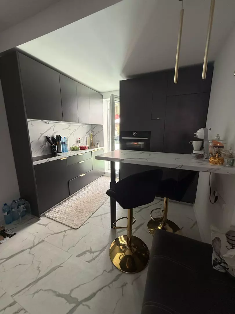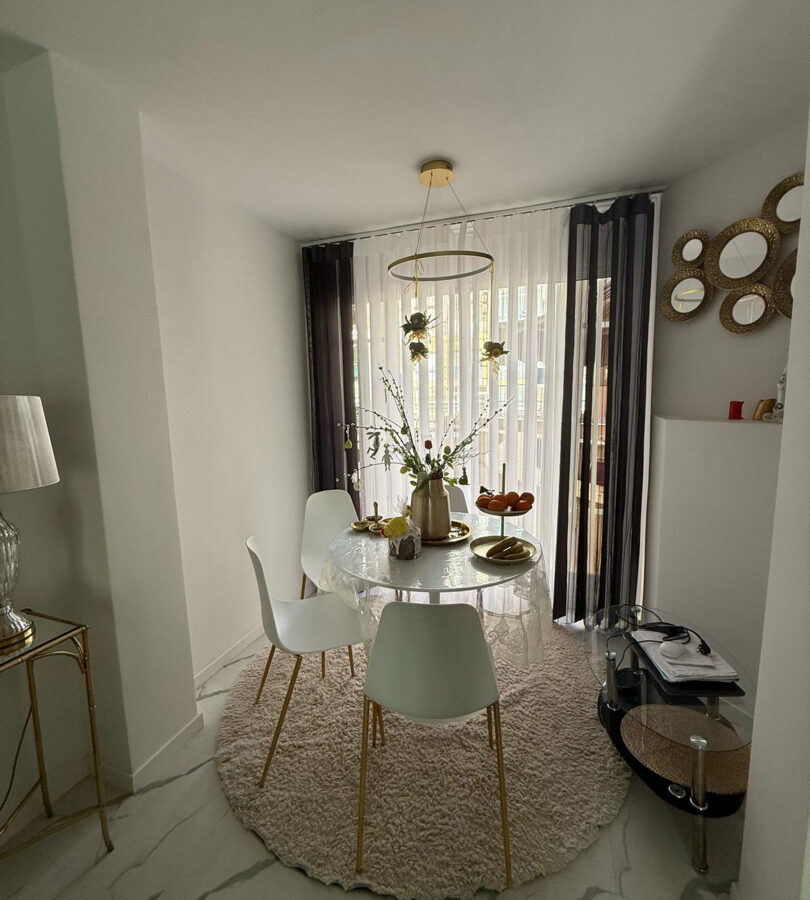 The living room is designed as an open-concept space combined with the kitchen. This layout allows for ease of movement and interaction, whether you’re cooking, eating, or just relaxing. Additionally, the apartment boasts two terraces, which provide options for outdoor seating or potential gardening.