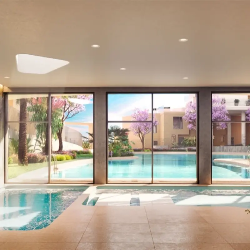 The villas include a large living room accompanied by an open kitchen, providing an inviting area for daily activities. Each unit is designed with large windows, allowing ample natural light to enter and providing views that enhance the living experience. The sun terraces, which start at 90 square meters, offer space to enjoy outdoor activities and relaxation.