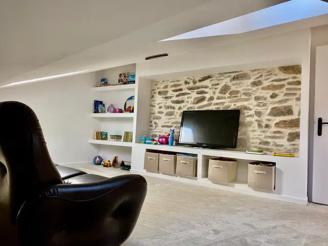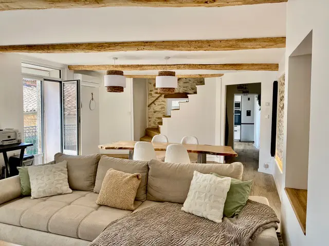 This character stone village house has undergone an extensive renovation over the past year, now offering 200 m² of living space. The interior layout is designed with a modern touch, featuring an open-plan lounge and dining area. A well-equipped kitchen opens to an 18 m² sunny terrace, ideal for outdoor dining. The property includes four bedrooms, two bathrooms (with potential for a third), and a 32 m² garage that allows for storage and even has a spa. This house effectively combines functional living with the potential for rental income or year-round family use.