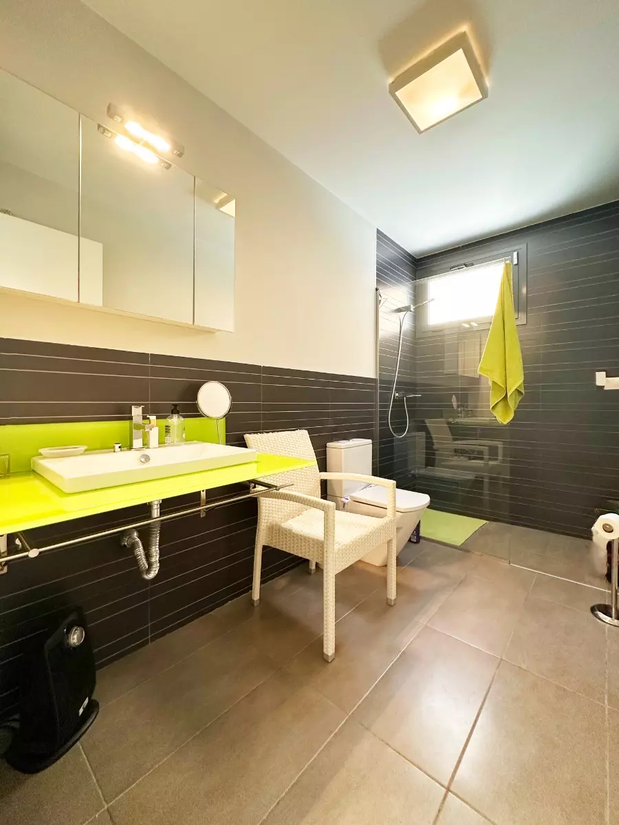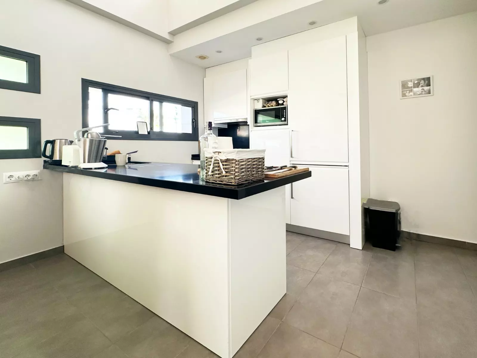 The living area is characterized by high ceilings, creating an open atmosphere, and the glass frontage ensures plenty of natural light fills the space. The current setup includes a lounge area leading into a dining space. At the far end is a modern kitchen with an island worktop designed for functionality. The layout encourages easy flow throughout, making it well suited for daily living. From the kitchen, there is a corridor leading to the first guest bedroom. This room includes fitted wardrobes and air-conditioning, and is followed by a family shower room. Additionally, there is a second guest bedroom on this level, which is slightly larger and includes fitted wardrobes as well as access to the lower terrace.