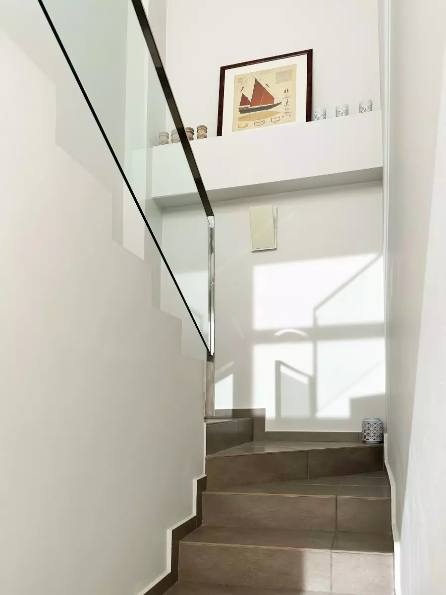 Returning to the living area, a stairway at the far end leads to the upper level. Upon reaching the landing, a shower room is located on the left, along with the master bedroom, which is the largest of the three bedrooms. The master bedroom also features fitted wardrobes, air-conditioning, and glass sliding doors that provide access to an upper terrace. The design prioritizes natural light, offering privacy for residents. The views from this terrace enhance the overall appeal of the property.