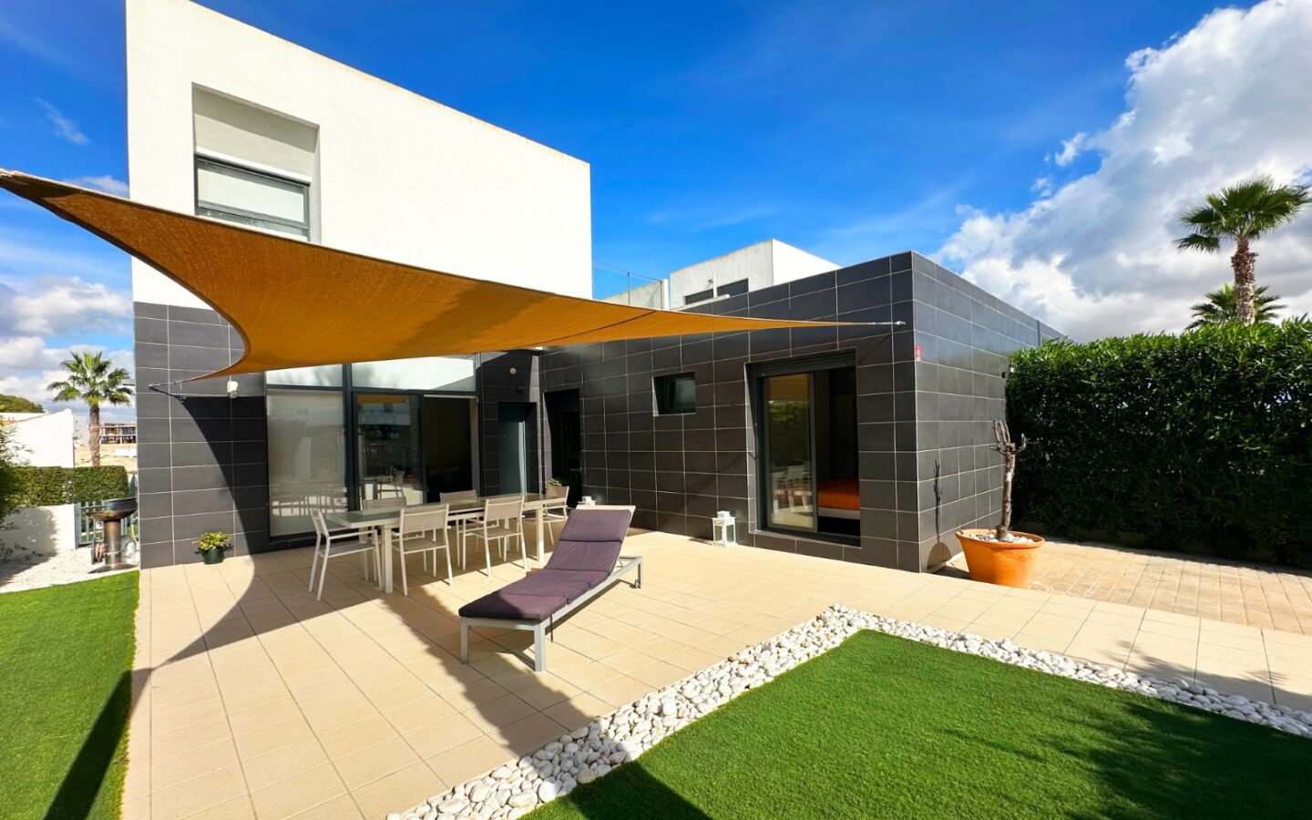 This property includes three bedrooms and two bathrooms and is located in the LA FINCA GOLF and SPA RESORT, in close proximity to ALGORFA on the COSTA BLANCA SOUTH. As you enter the villa’s grounds, a private drive is situated on the right. On the left, there is a landscaped garden featuring grassy areas, pebble beds, and a variety of plants. The villa also has a wrap-around lower terrace, providing ample areas for outdoor dining, complete with a canvas awning for shade. The south-facing orientation of the villa is complemented by a courtyard terrace, ideal for relaxation with family and friends.