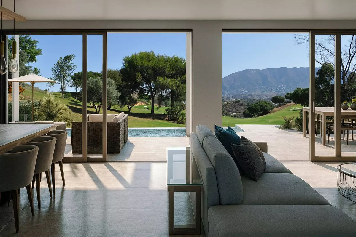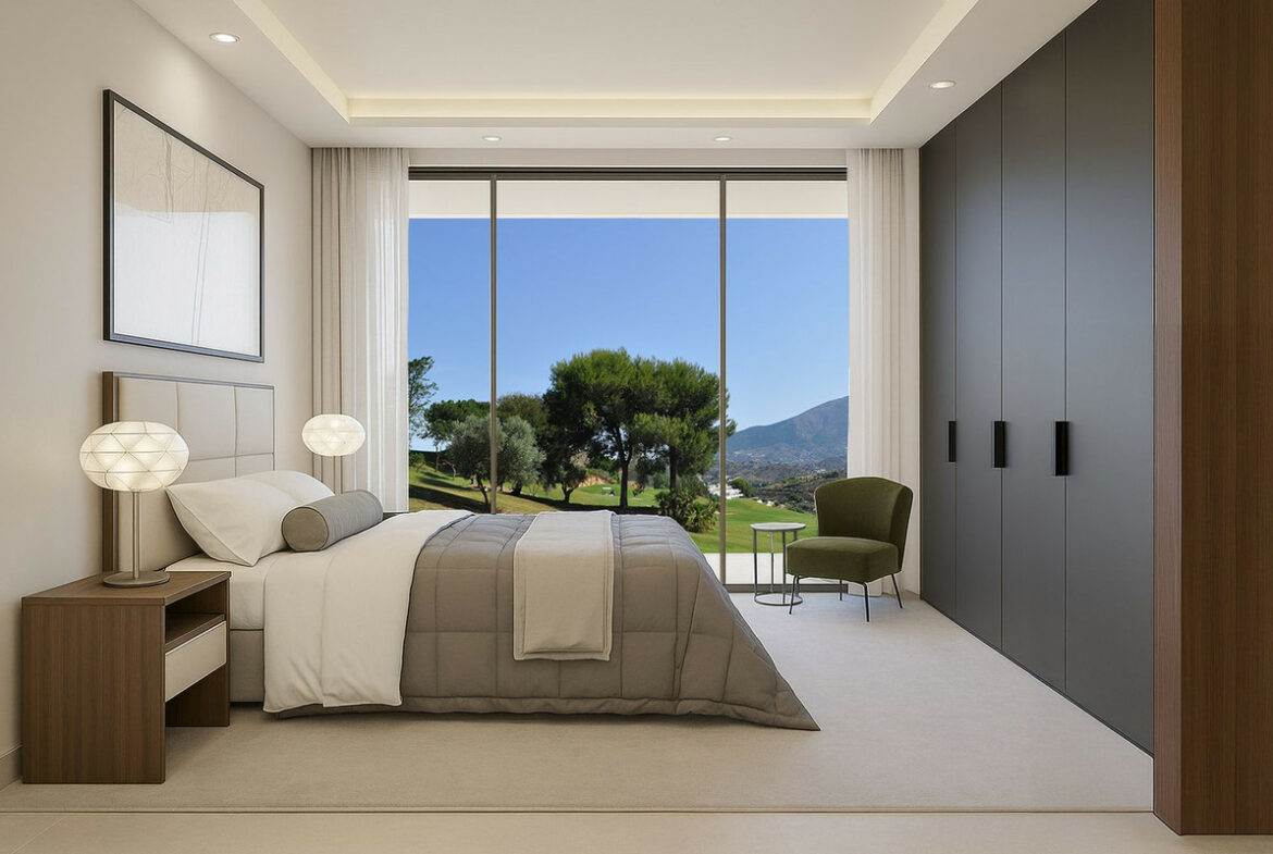 The upper level accommodates three bedrooms, offering privacy and comfort for all family members. The master suite includes a walk-in wardrobe and an en-suite bathroom, along with views of the surrounding golf course and mountains, perfect for morning or evening relaxation.