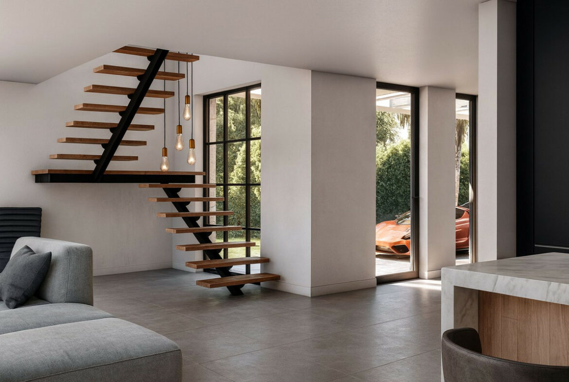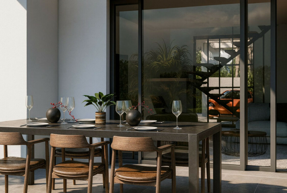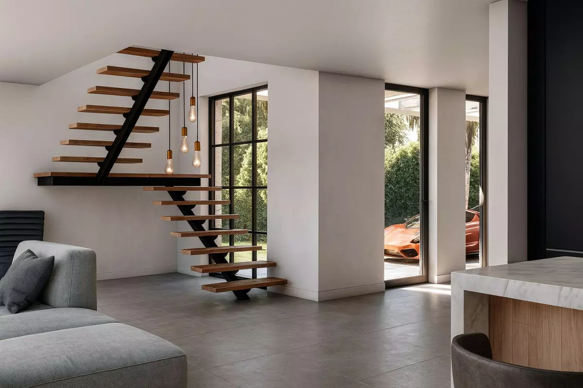 Upon entering, you’ll notice an open-plan design that connects the living and dining areas seamlessly. The kitchen boasts a large island, suitable for casual meals or entertaining guests. A lounge area extends to a porch, providing a spot for gatherings or quiet moments in privacy.