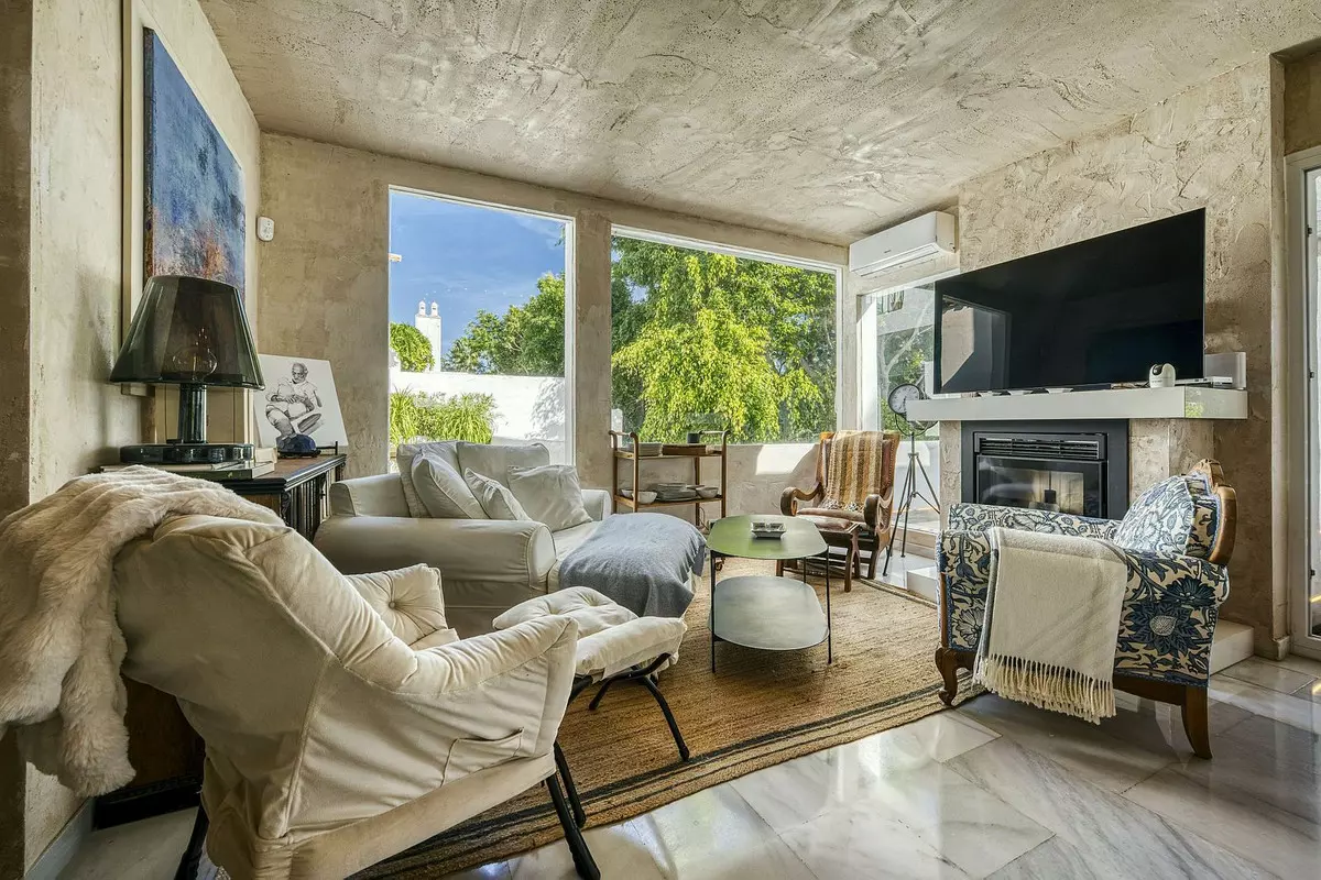 Upon entering, you’ll find a living room that strikes a balance between sophistication and serenity. A grand domed ceiling complements a working fireplace, while double-aspect windows allow for an abundance of natural light. Glass doors extend to a covered terrace, which overlooks the gardens and provides a setting for outdoor dining or relaxation in the evenings.