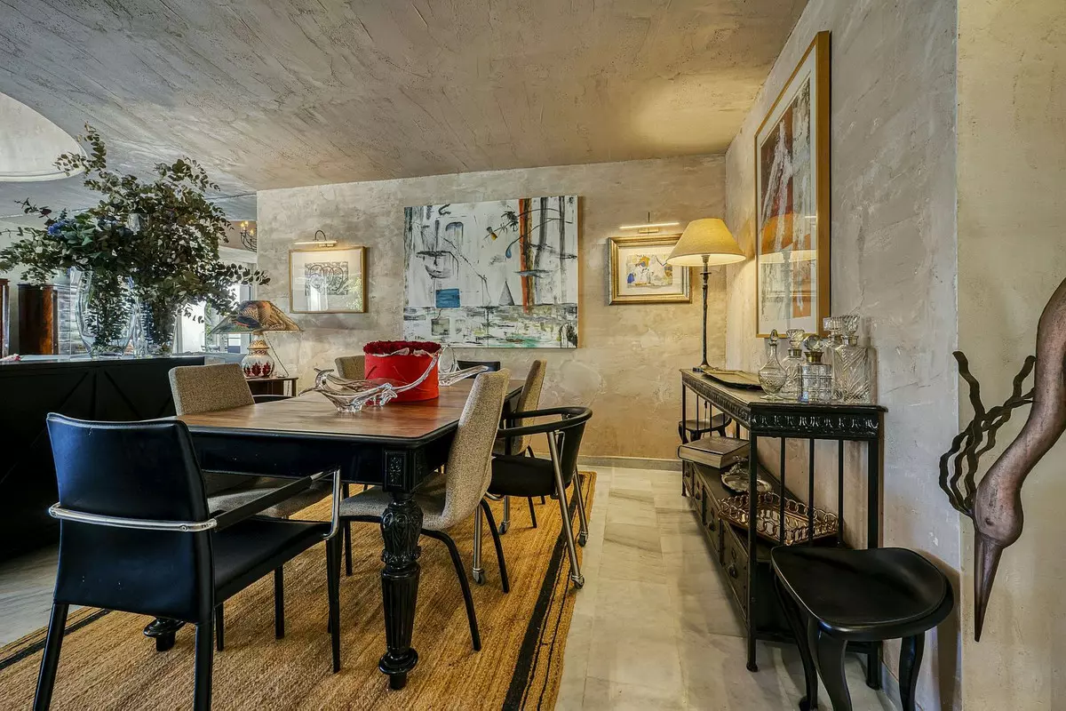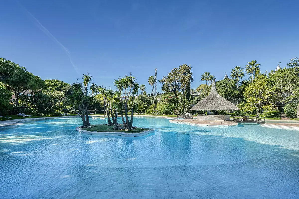 Discover a unique living experience in this penthouse duplex located in Guadalmina Baja, a property nestled among well-maintained gardens and tranquil water features. The outdoor space includes winding pathways flanked by palm trees and vibrant plant life, leading to a serene stream with koi fish and lily pads. This design by a skilled landscape architect creates a peaceful atmosphere ideal for relaxation.