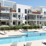This residential complex features a swimming pool, offering a communal space for residents. The apartments themselves have a practical layout, with a living-dining room and an open kitchen that blends functionality with modern design. Each apartment includes 2 bedrooms and 2 bathrooms, making it suitable for small families or individuals.