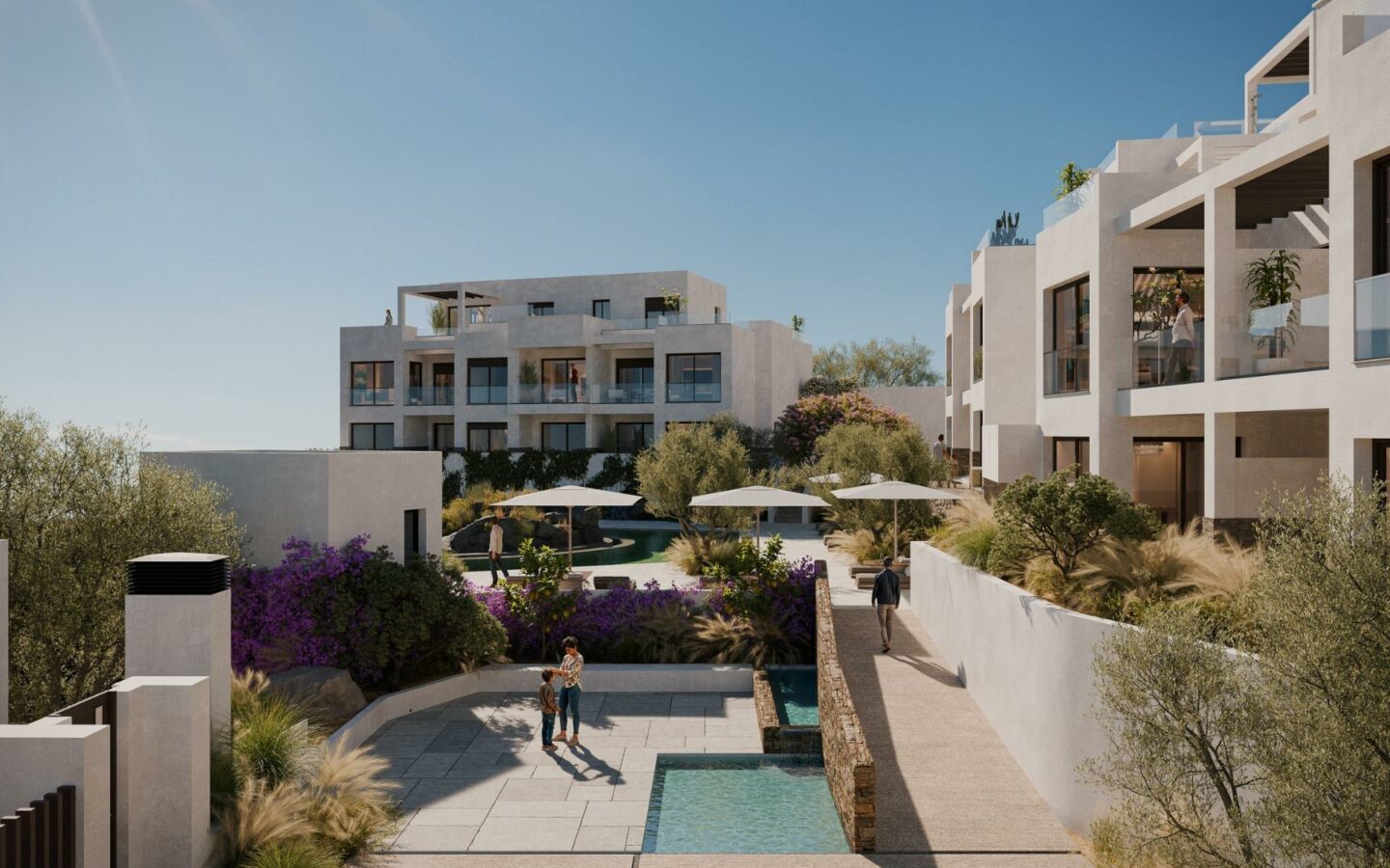 This gated complex offers various apartments, including 1, 2, and 3-bedroom units, featuring impressive penthouses and ground-floor options complete with private gardens. Some properties even come with an optional private pool. Each apartment includes expansive terraces, designed to maximize stunning views of the coastline. Additionally, all homes provide parking and a storage room for convenience.