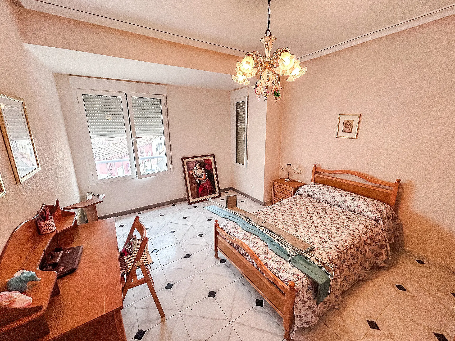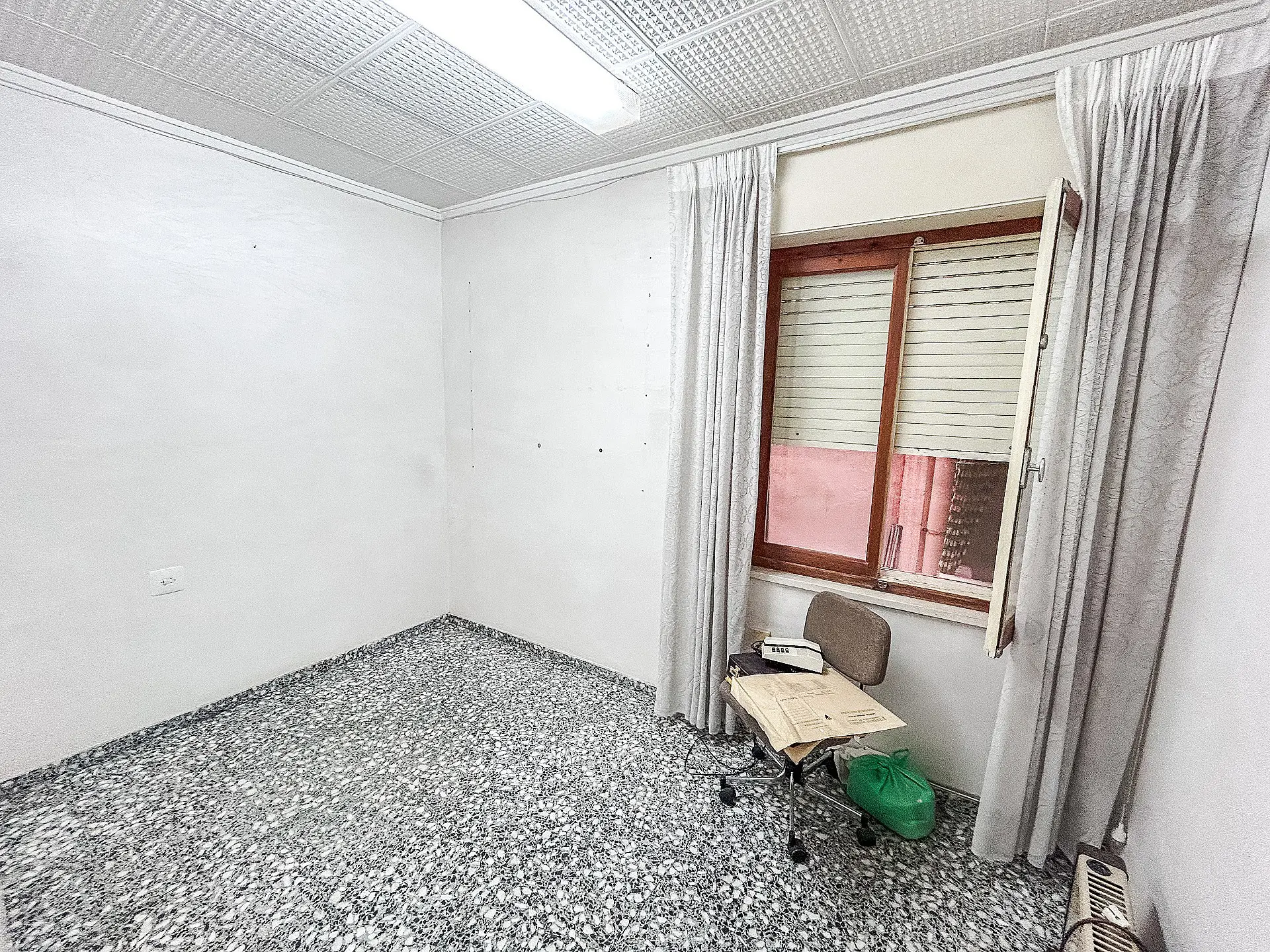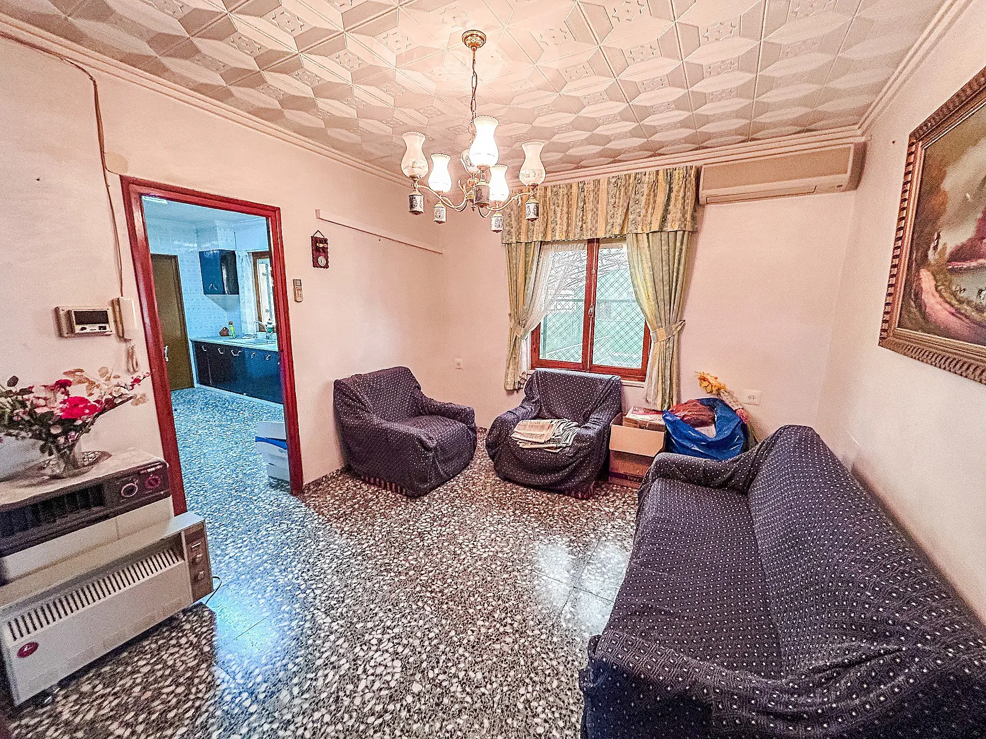 The first-floor apartment spans approximately 125 m² and presents an opportunity for refurbishment and modernization. Its layout features three bedrooms, one bathroom, an office, a living room with an integrated kitchen, a pantry, and a guest toilet. This apartment comes equipped with air conditioning, and the existing furniture is included in the sale.
