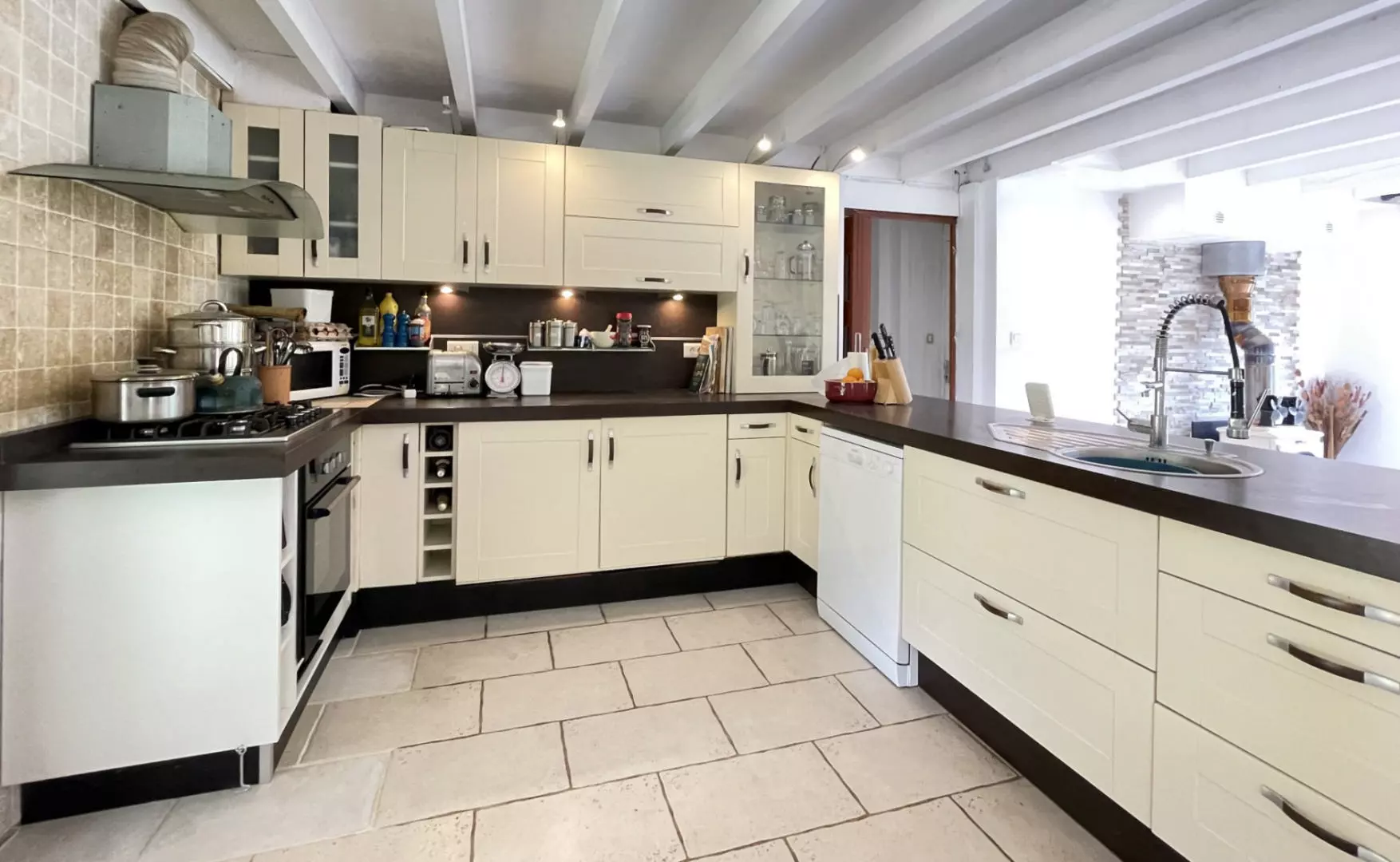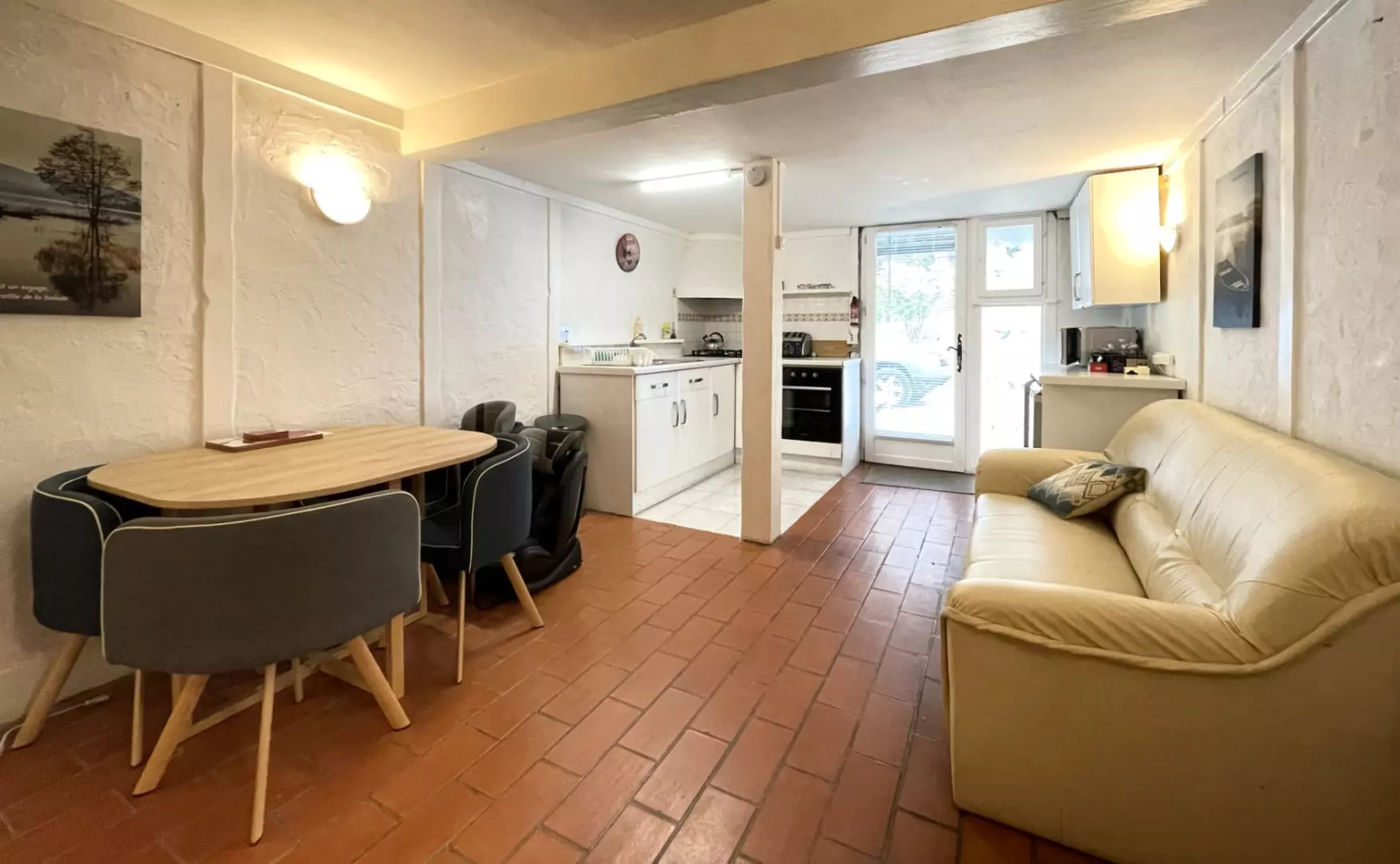 The lower level has been converted into an open plan gîte, making it suitable for family or as rental accommodation. This area includes its own private entrance, ensuring guest privacy. The gîte features a living area that combines a kitchen, dining space, and a living room, along with a shower room, WC, and a bedroom. The lower level also contains a garage and two cellars, each measuring 20 m².