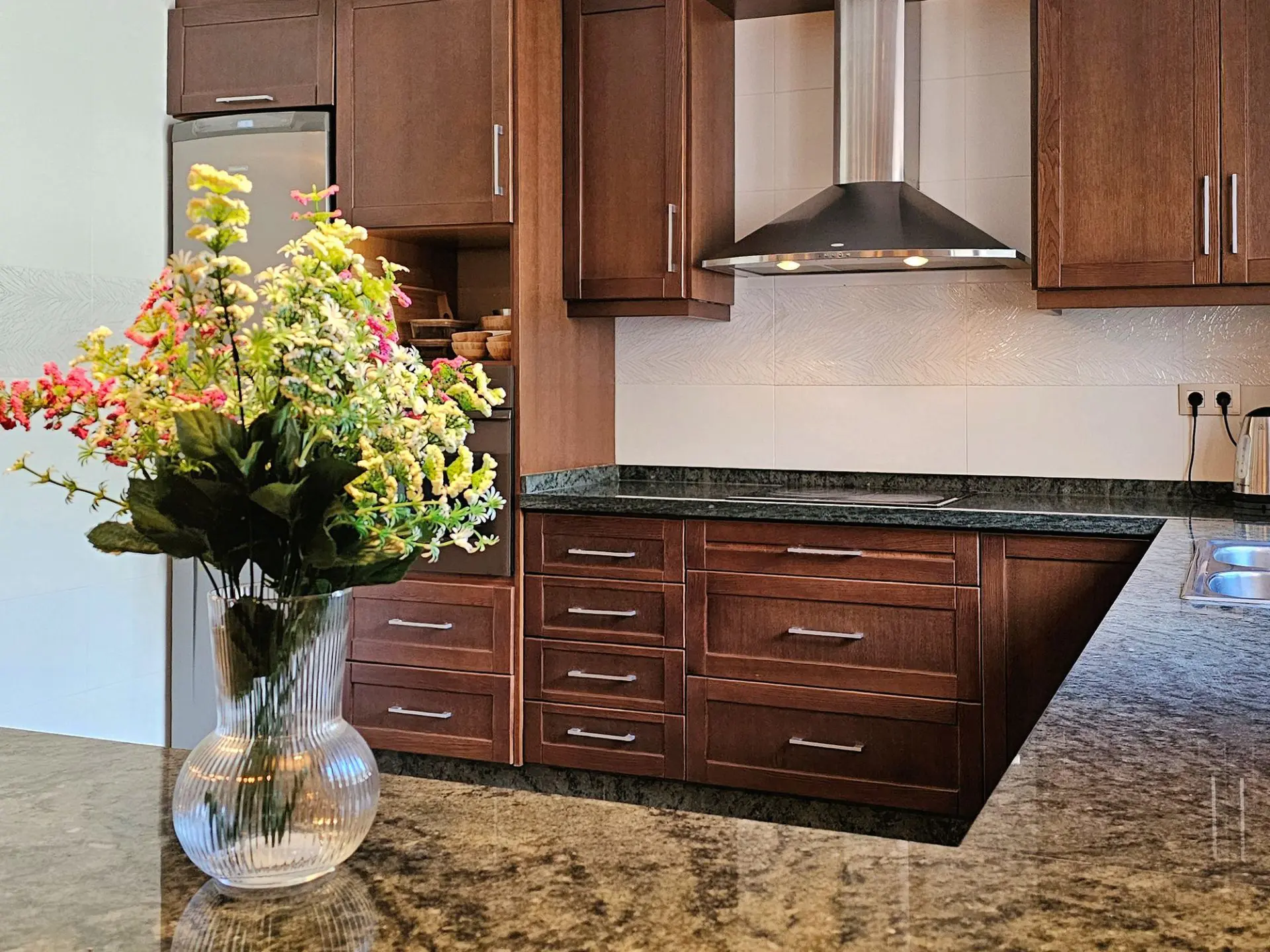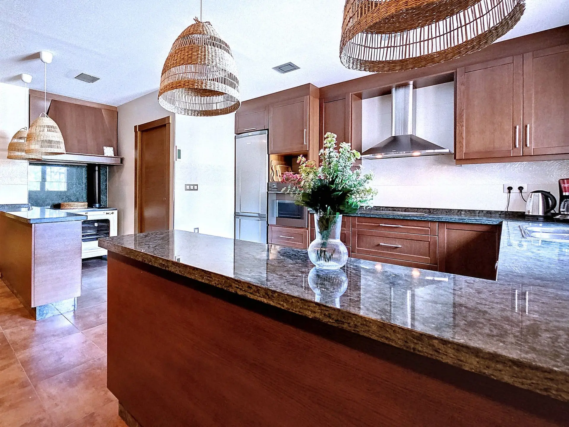 This estate has an interesting history. Originally used as a bodega (winery), it has been completely renovated, highlighting quality craftsmanship and modern finishes. Enter through a spacious hall that leads to an open-plan living and dining area, enhanced by vaulted beamed ceilings. This area is well-suited for gatherings and social events.