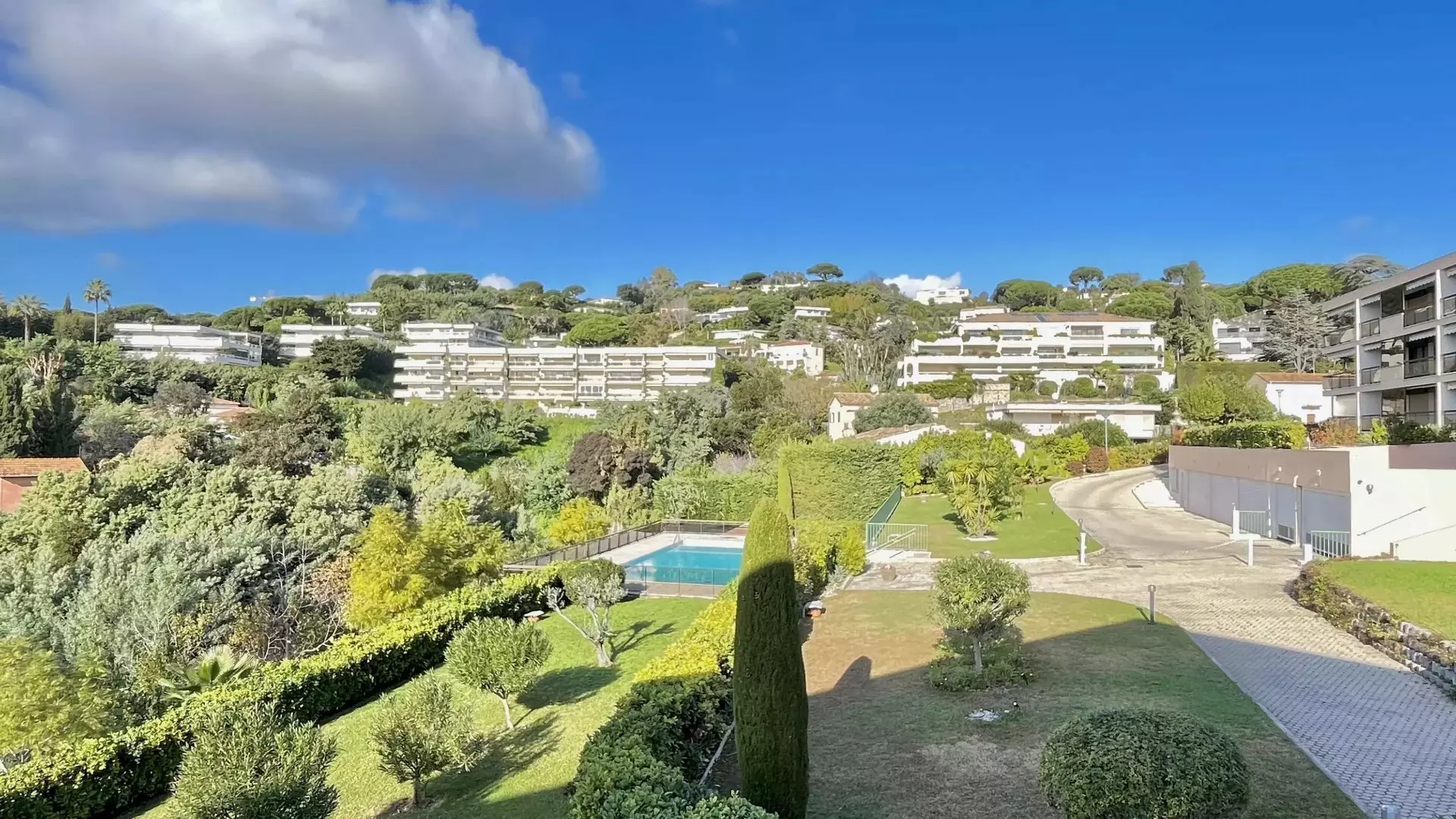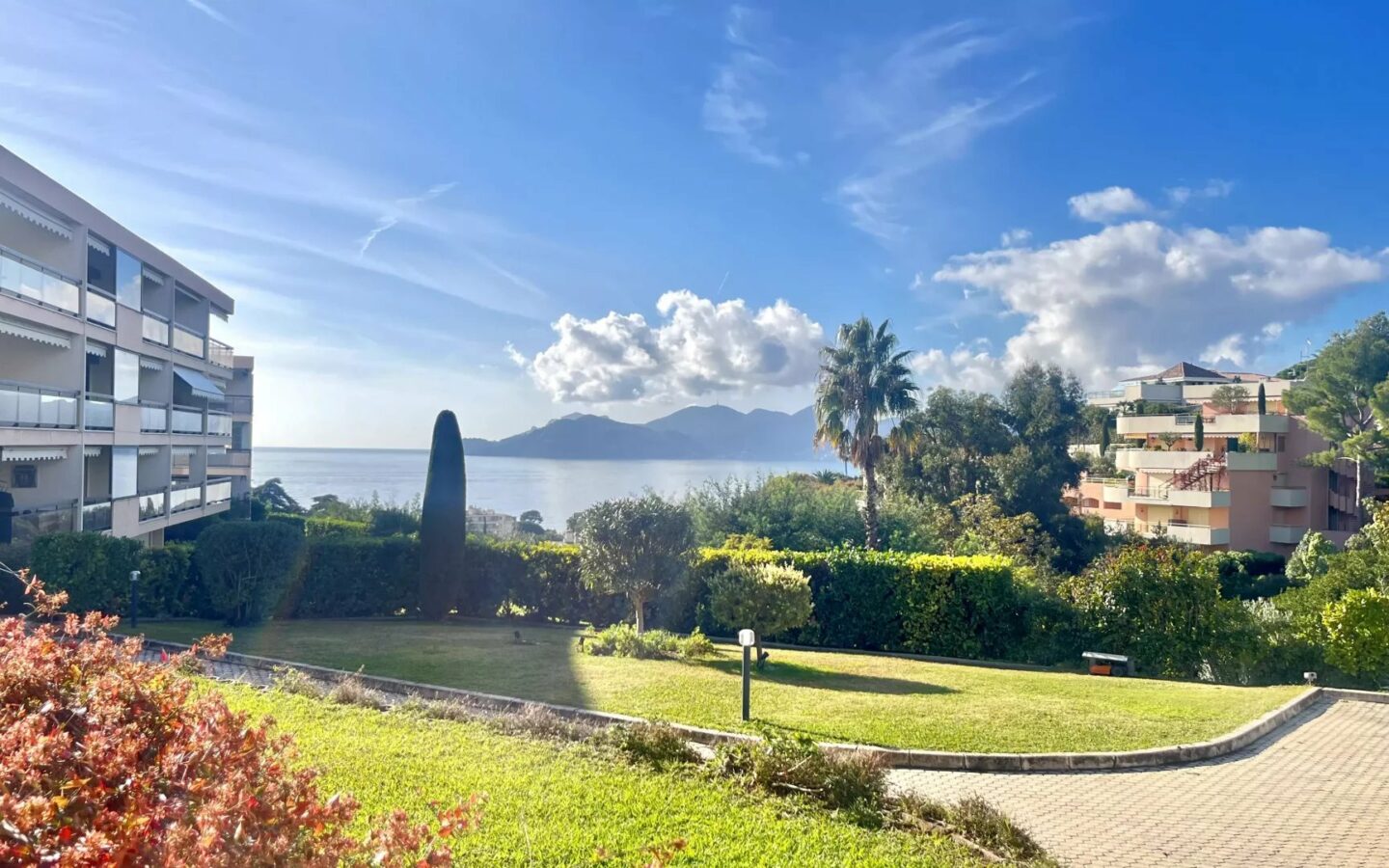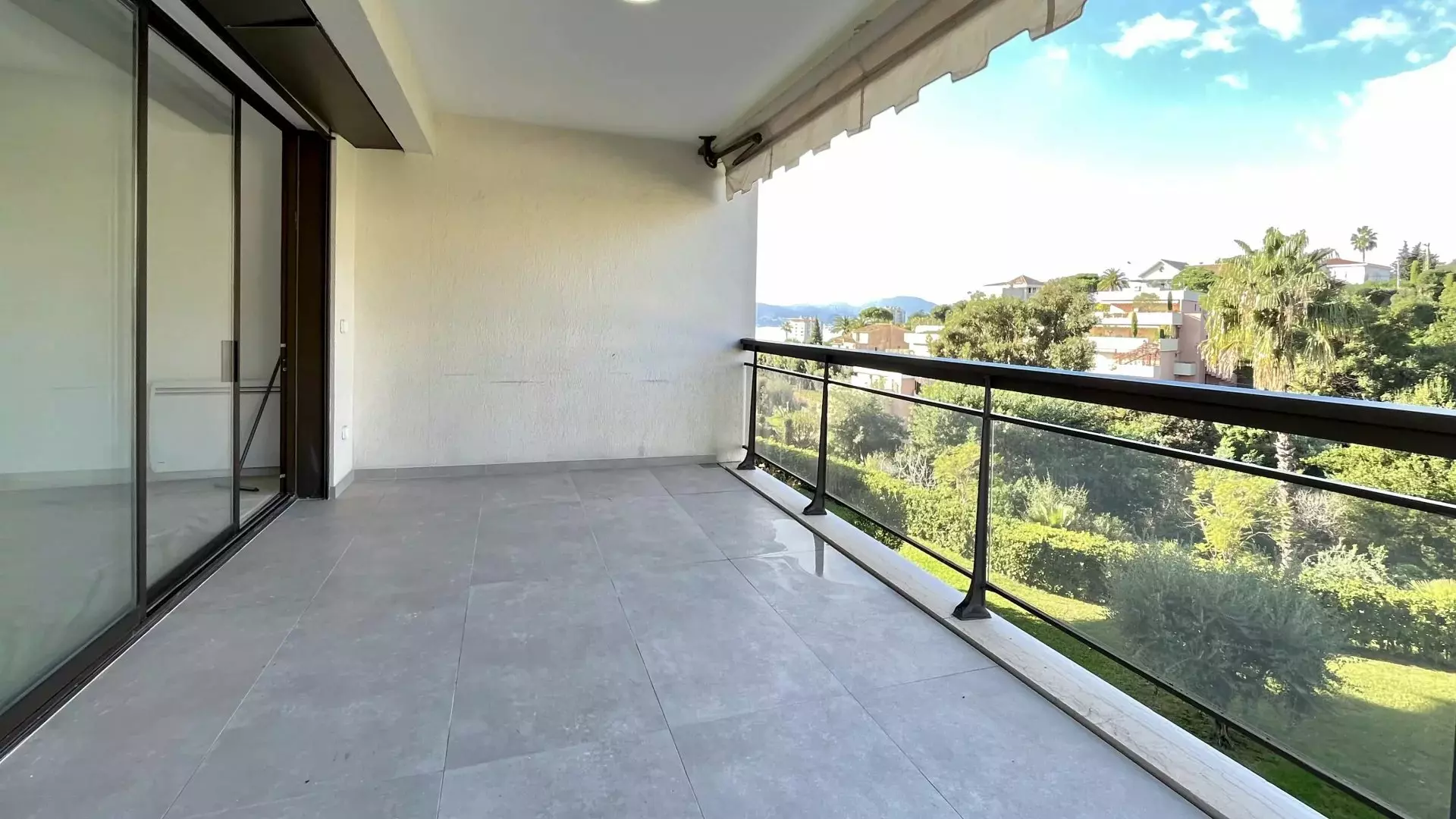 This property, located in Cannes at Croix des Gardes, features a three-room layout with a terrace that offers views of the sea and surrounding hills. The apartment spans 96 square meters, which includes 86 square meters of living space along with an 11-square-meter enclosed loggia.
