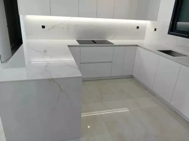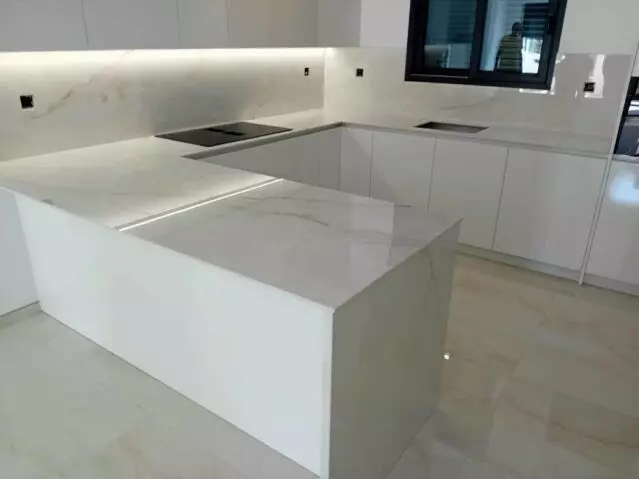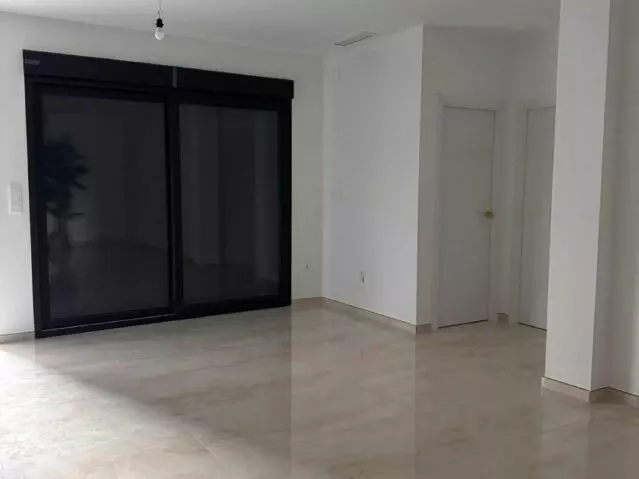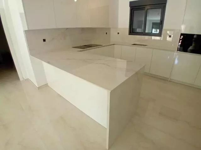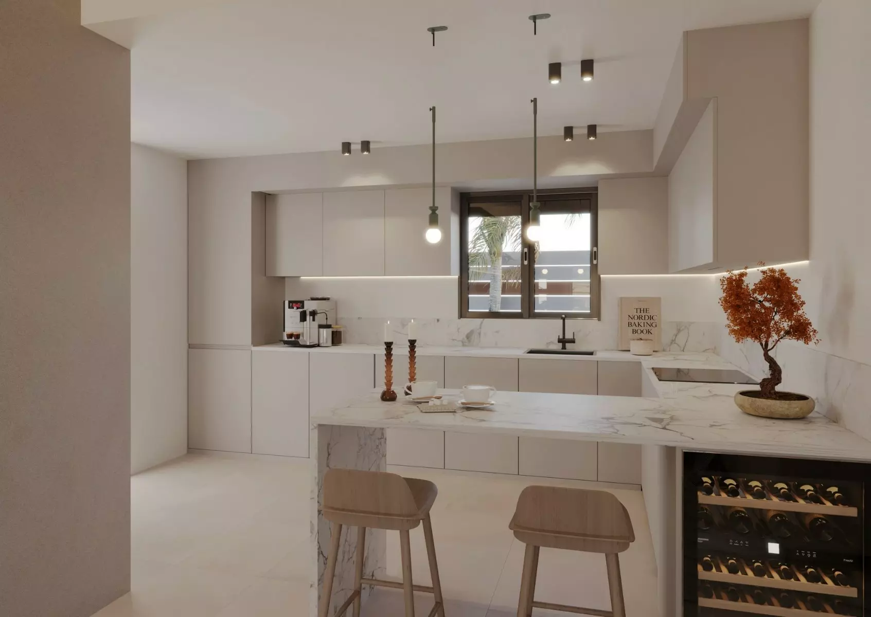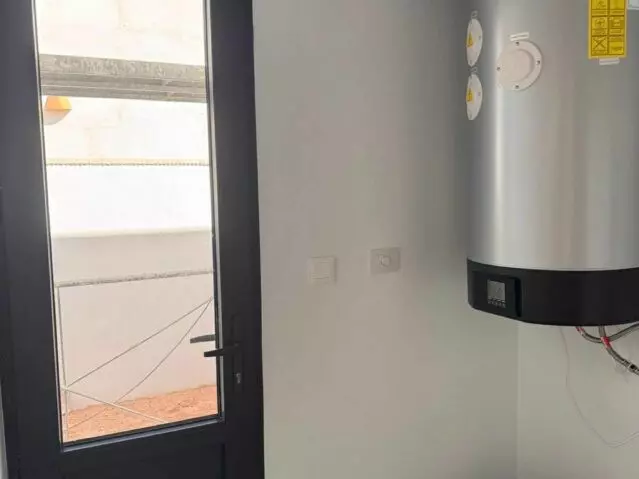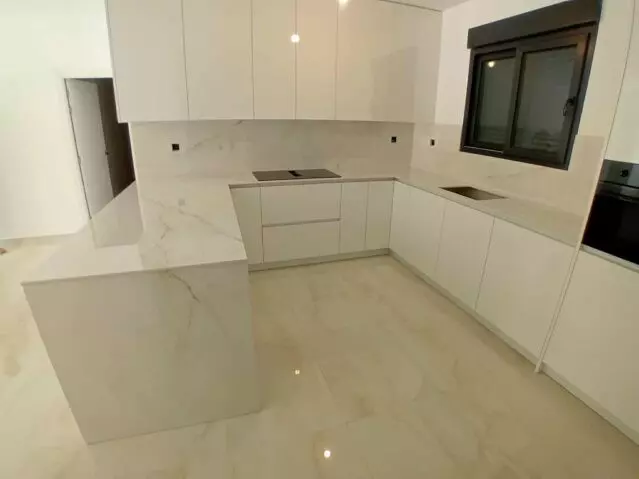 The kitchen is fully fitted, featuring upper and lower cabinets that reach the ceiling. It includes a worktop made of Silestone or a similar material, along with pre-installed spaces for appliances such as a fridge, dishwasher, and oven. Next to the kitchen, a utility room serves as a functional addition for household tasks.