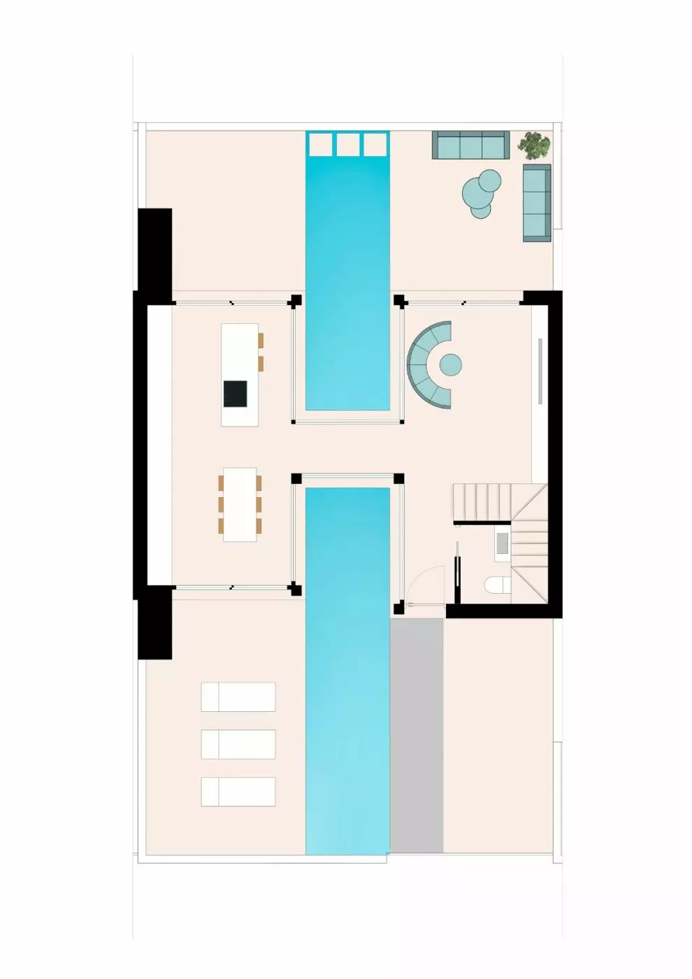 These townhouses come equipped with 3 bedrooms and 2 bathrooms, making them suitable for a variety of living arrangements. The layout includes an open plan kitchen that seamlessly merges with the living area. This design promotes a sense of spaciousness and flow. Each unit also includes an 18-meter swimming pool that sits conveniently between the terrace and parking space.
