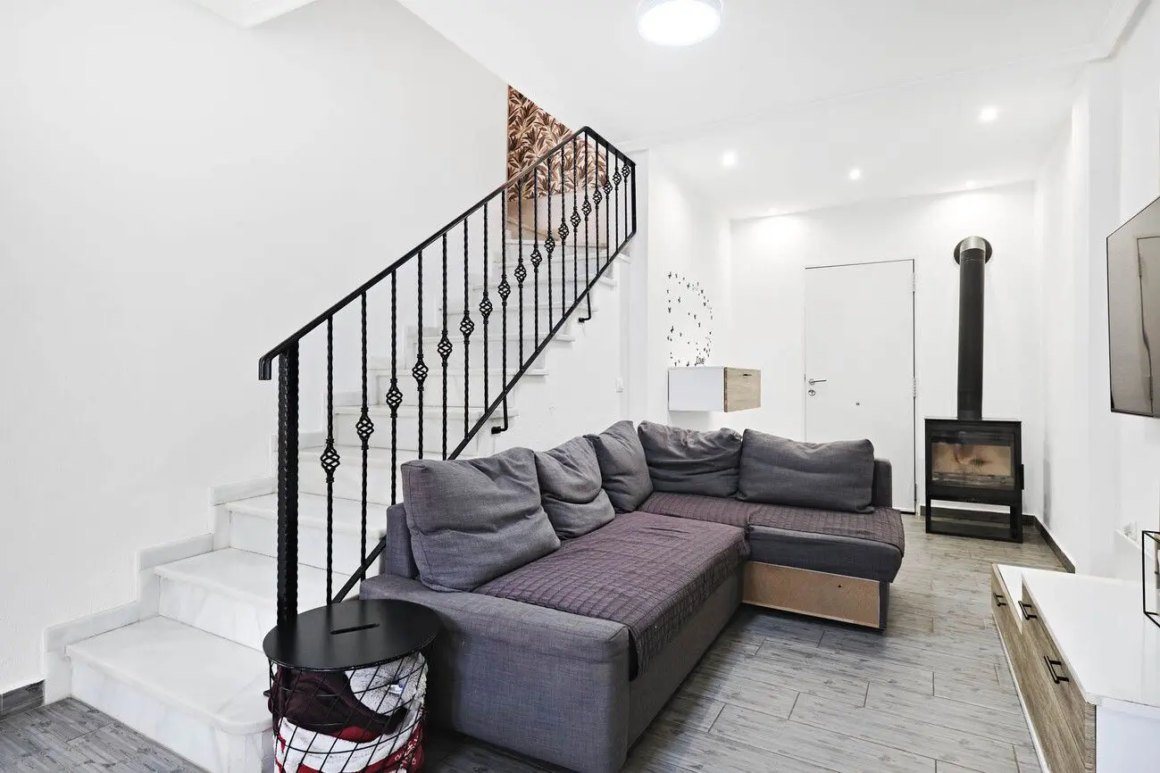 The ground floor welcomes you with a cozy terrace leading into a bright living room with an open fireplace, dining area, and a fully equipped kitchen. You’ll also find a bedroom with built-in wardrobe, a guest toilet, and access to a private rear patio — perfect for morning coffee or outdoor dining. Upstairs features two additional bedrooms and a family bathroom, while the rooftop solarium offers a tranquil space for sunbathing or evening gatherings under the Mediterranean sky. The home is part of a well-maintained community with a beautiful swimming pool surrounded by lush gardens — the perfect setting for relaxation and social life.