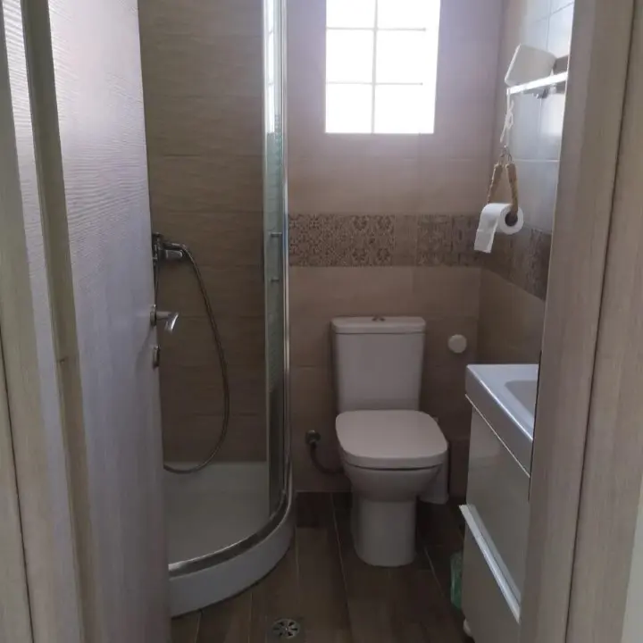 The apartment includes two bedrooms, making it suitable for various living arrangements. A combined living room and kitchen area provides a central space for daily activities, while a shower WC is available for convenience. This front-facing flat includes essential amenities such as solar panels for water heating and air conditioning.