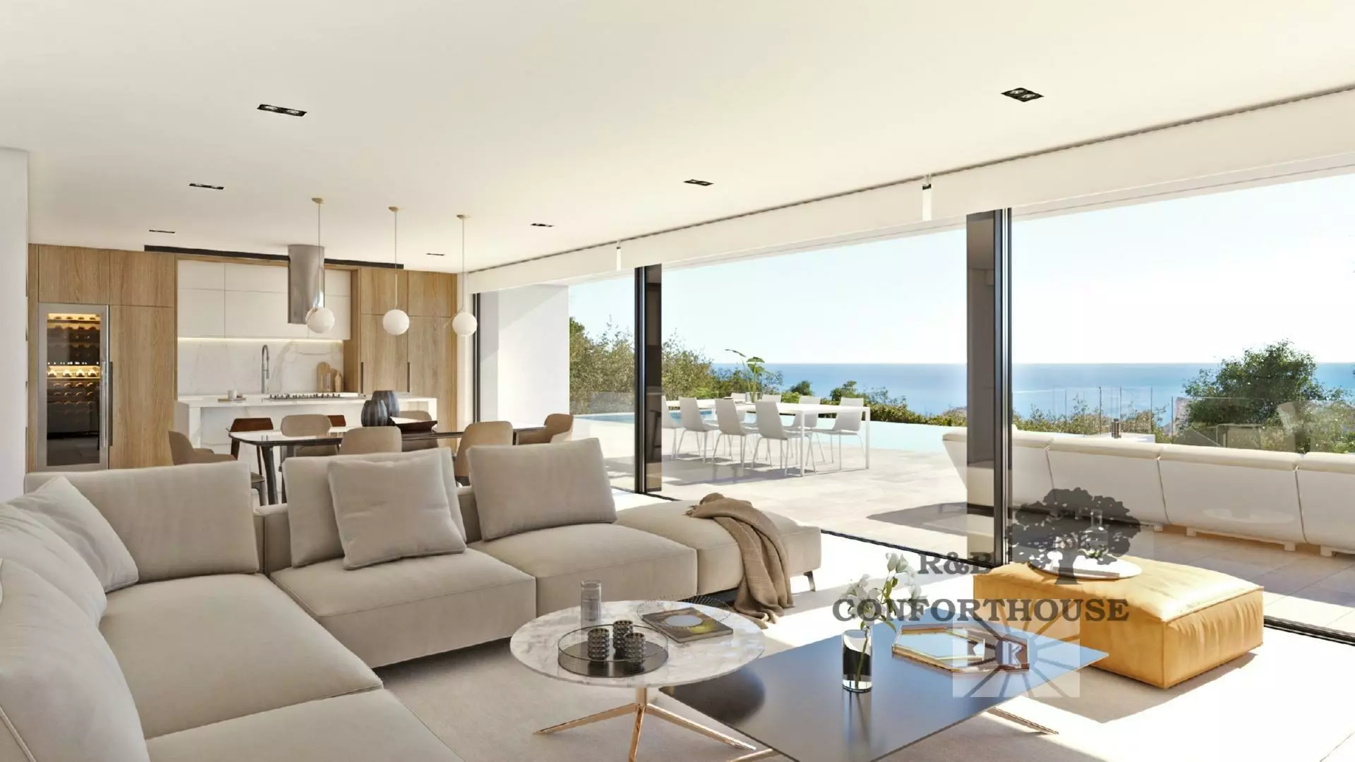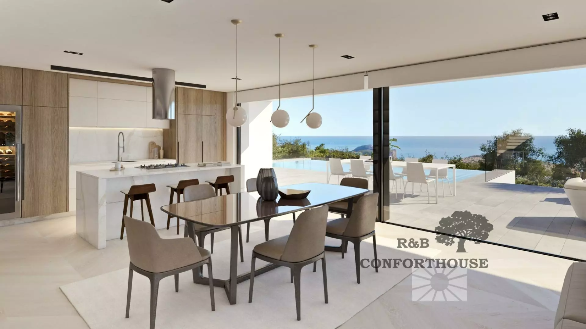 On the same level, you’ll find the open-plan living room and kitchen, designed to enhance your lifestyle. The kitchen features a stylish island that connects seamlessly to the living space, ideal for entertaining friends and family. Imagine hosting a gathering while enjoying panoramic views through the floor-to-ceiling windows that lead to a stunning solarium with an infinity pool that appears to blend into the sea.