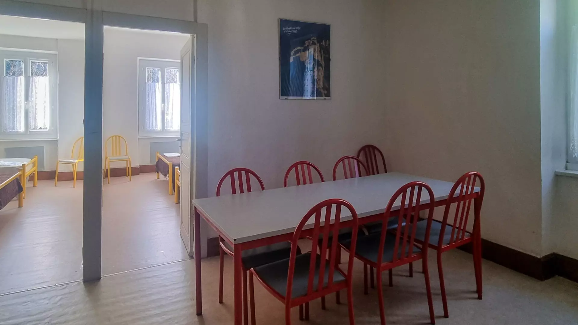 In addition to private accommodations, the property boasts several communal spaces. This includes a reception hall centered around a fireplace, which can serve well during gatherings. A large dining room and shared kitchen facilitate group meals and interactions among guests or residents.