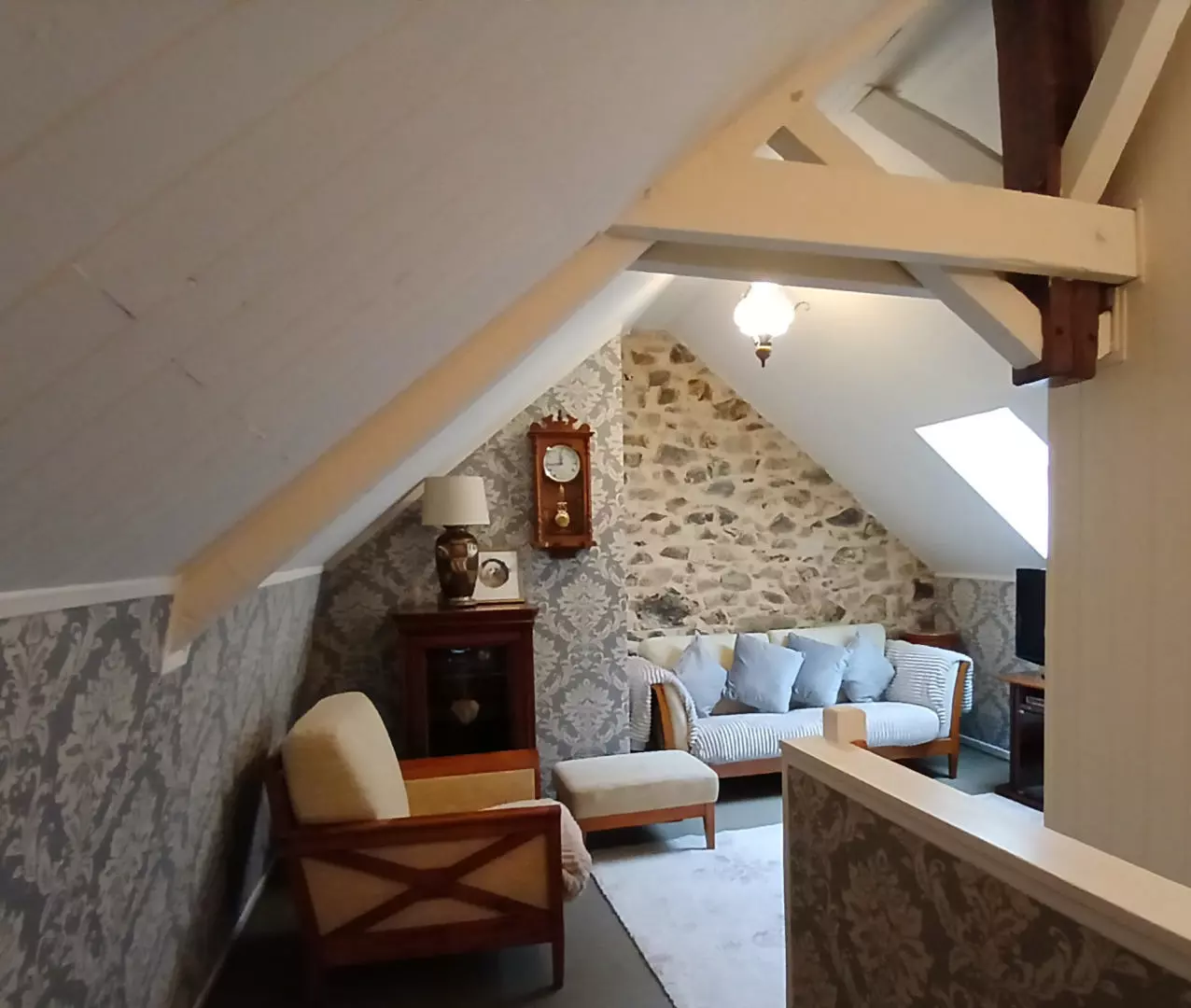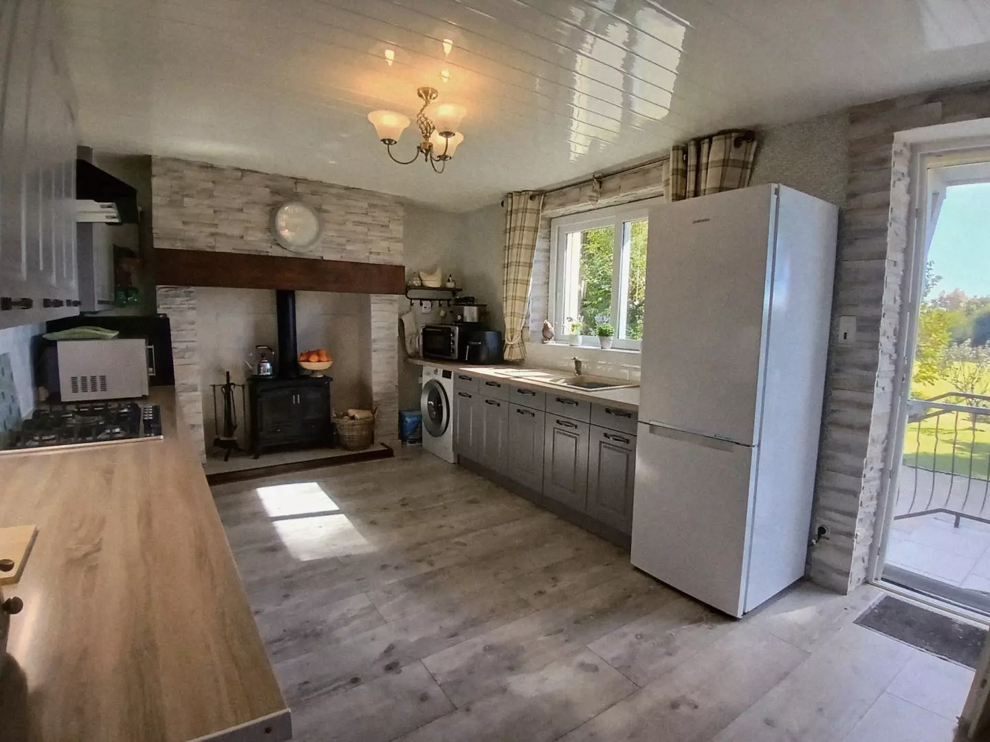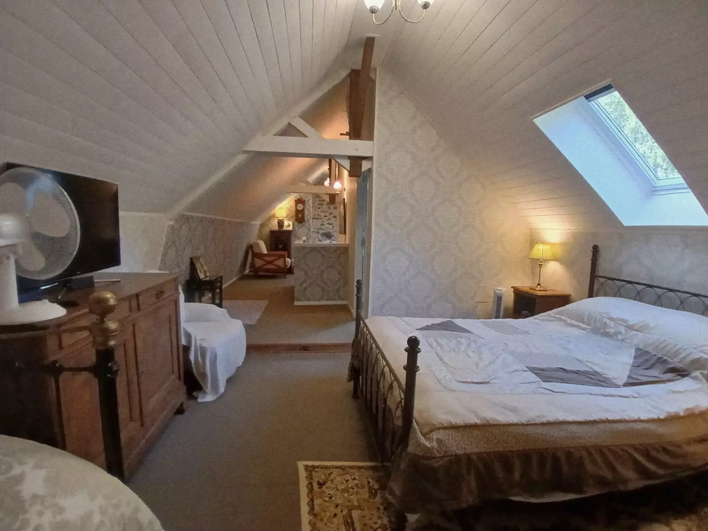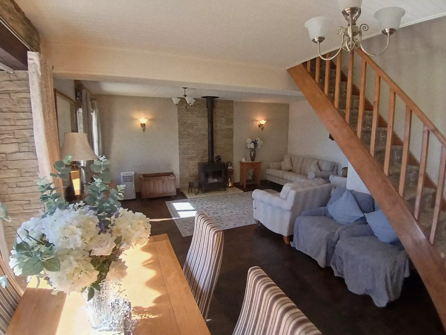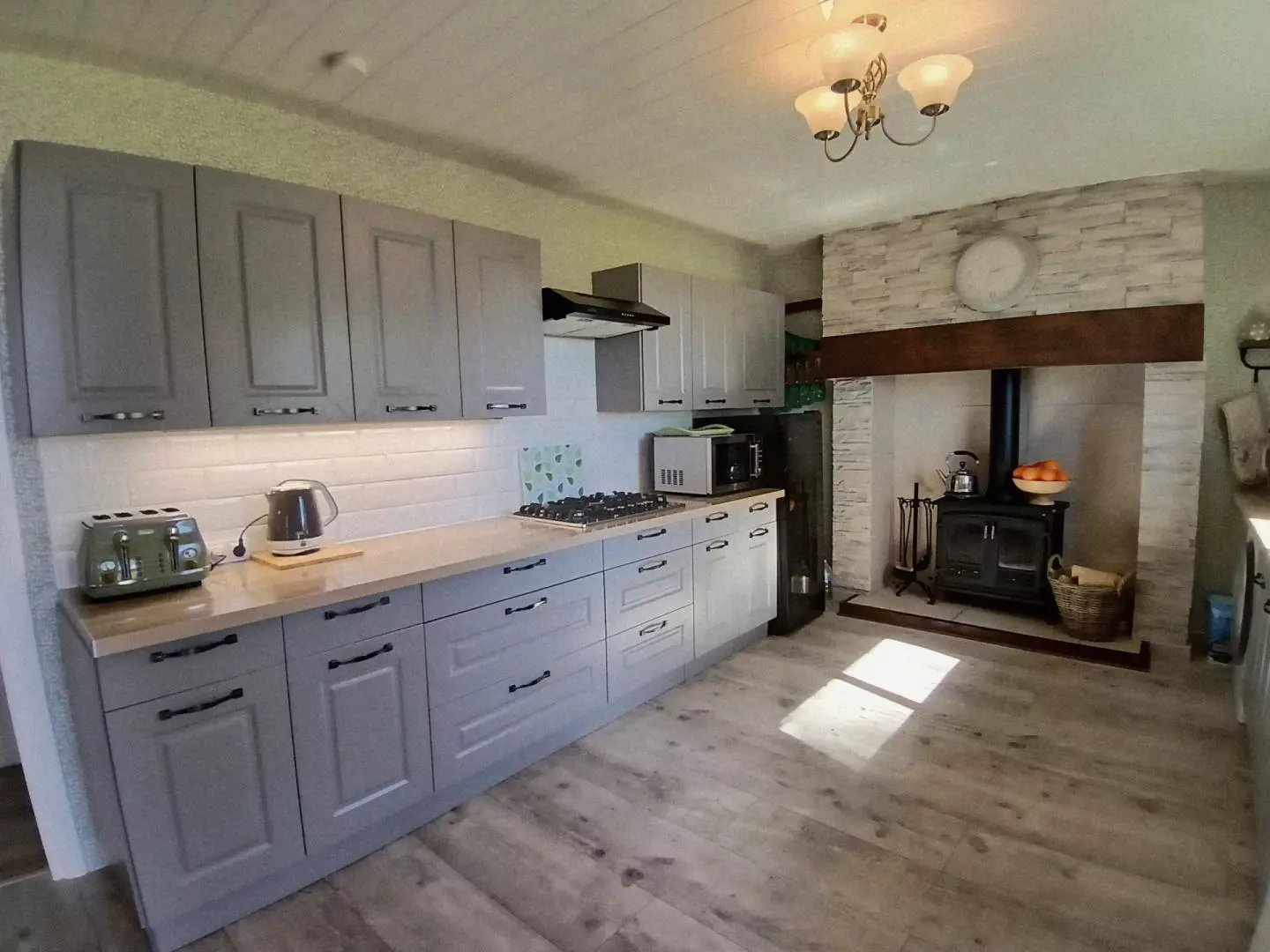 Upon entering through the front door, you find a modern kitchen equipped with a woodburner. Double doors then lead into the living room and the ground floor bedrooms. Each bedroom comes with its own shower room, ensuring privacy and convenience. The living room is L-shaped, featuring a woodburner and sliding doors that open onto the front terrace. Stairs lead up to a converted attic area.