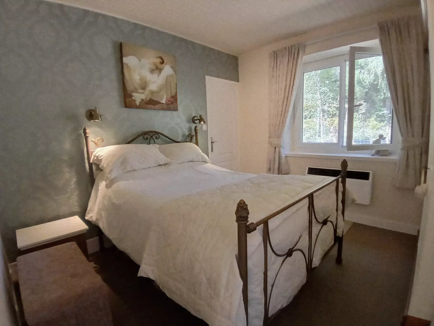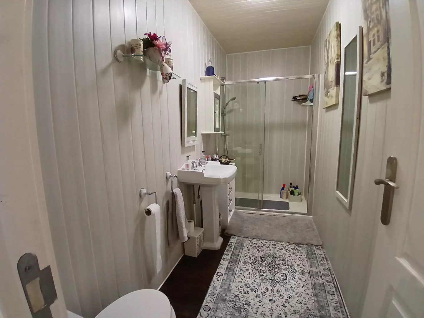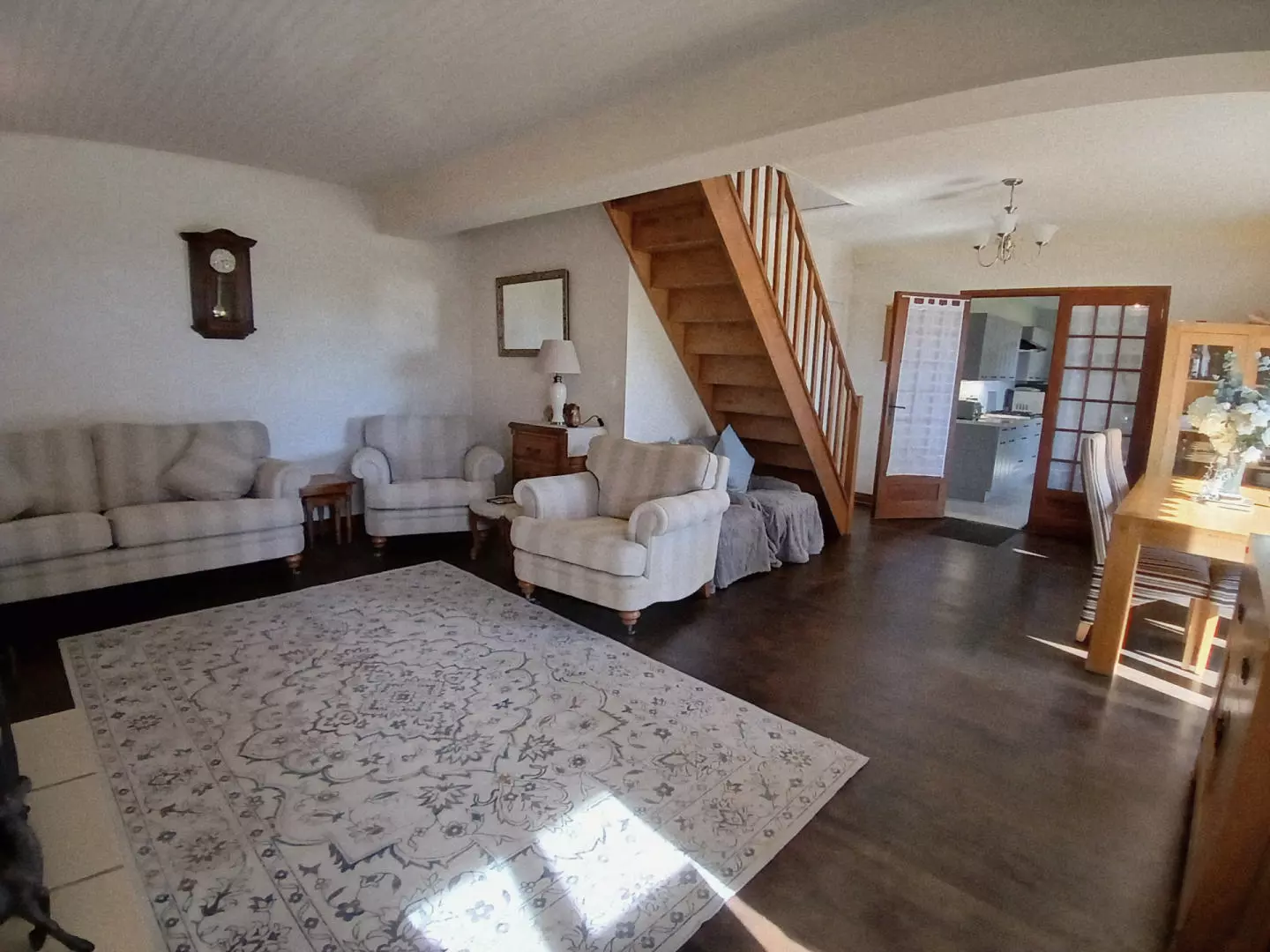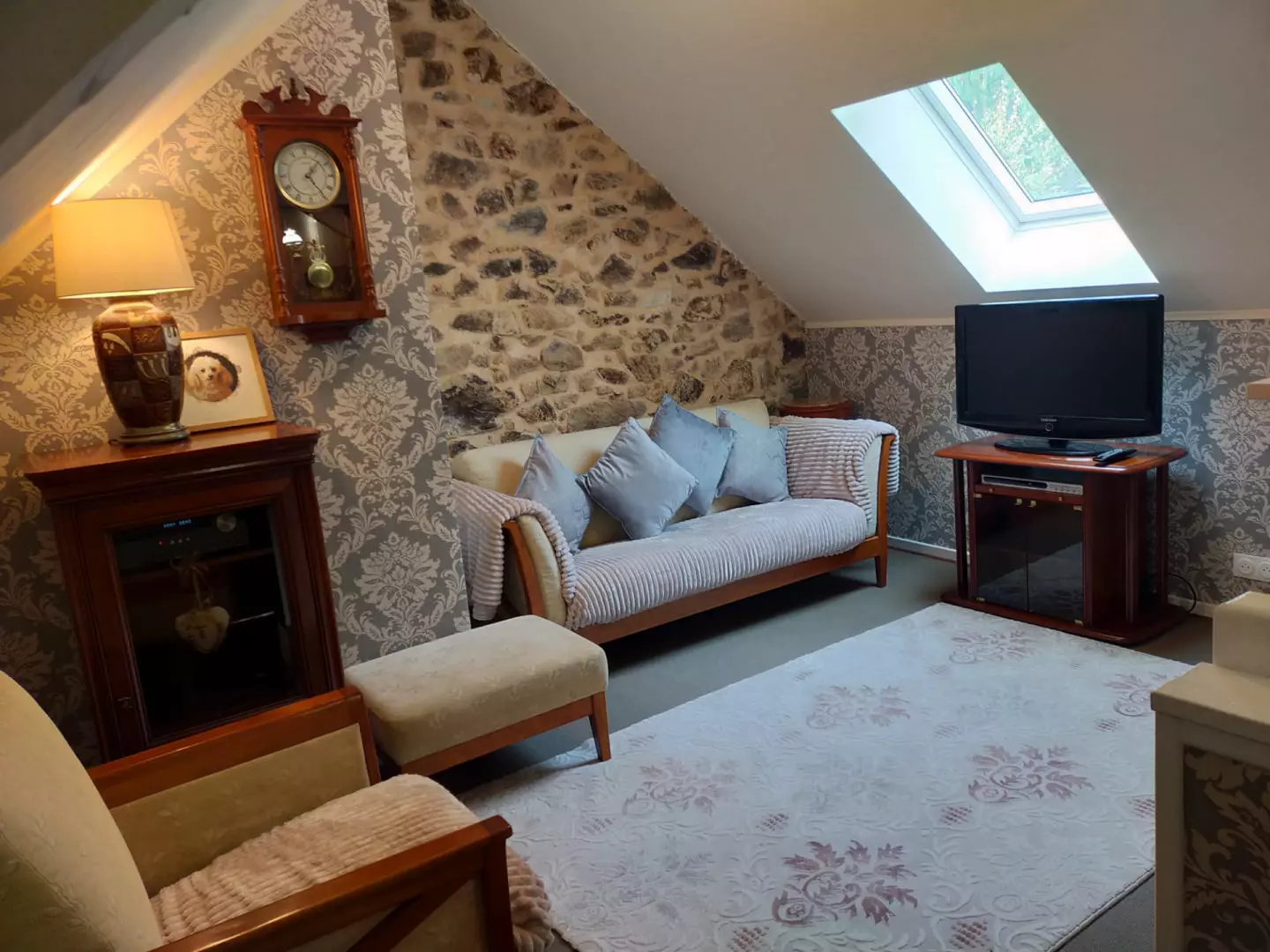 Upon entering through the front door, you find a modern kitchen equipped with a woodburner. Double doors then lead into the living room and the ground floor bedrooms. Each bedroom comes with its own shower room, ensuring privacy and convenience. The living room is L-shaped, featuring a woodburner and sliding doors that open onto the front terrace. Stairs lead up to a converted attic area.
