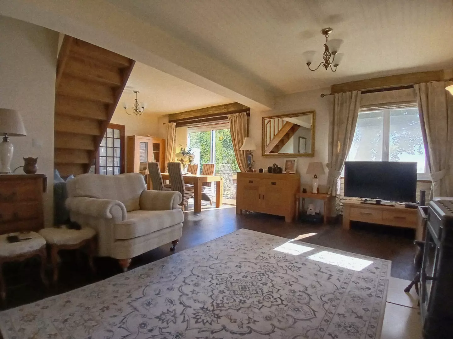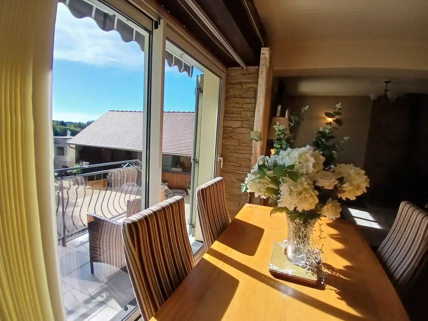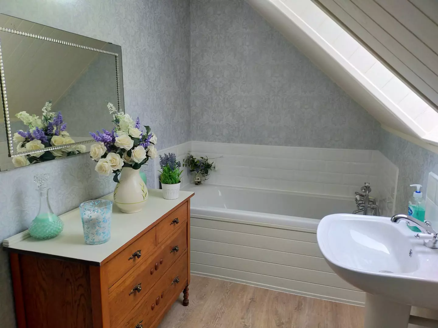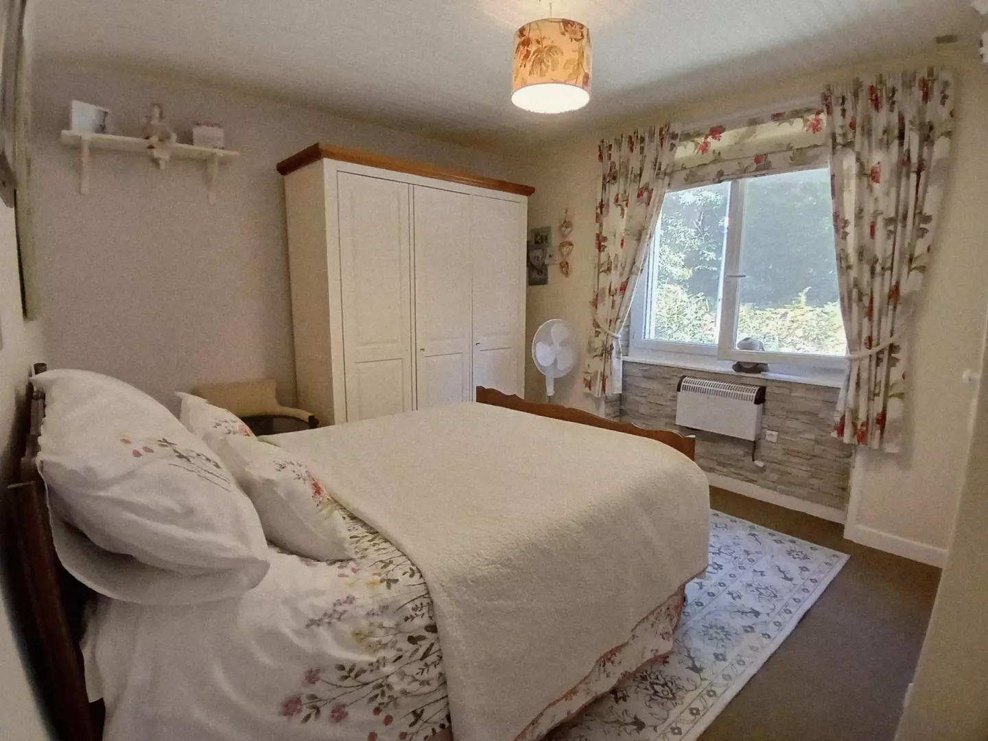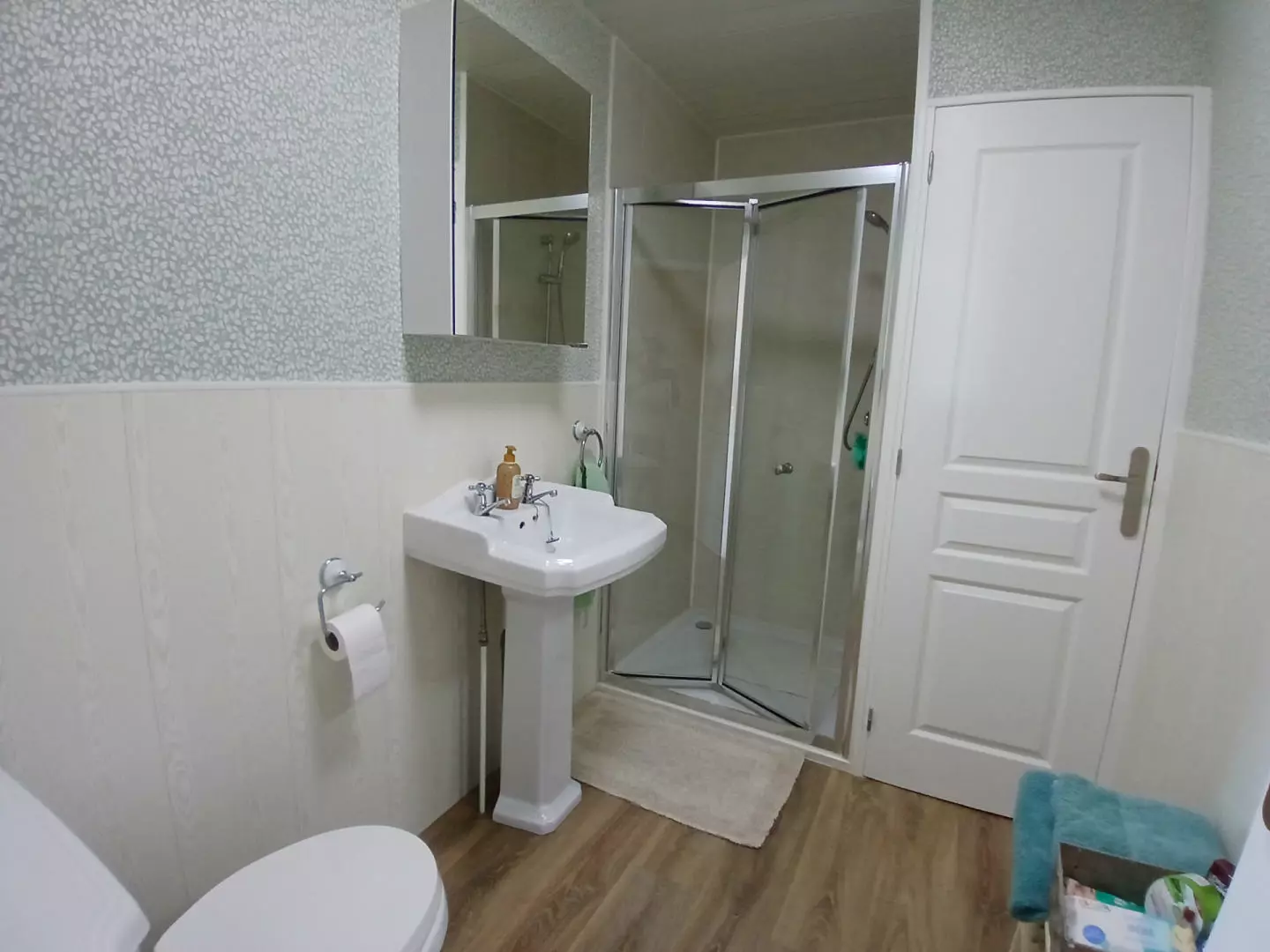 Upon entering through the front door, you find a modern kitchen equipped with a woodburner. Double doors then lead into the living room and the ground floor bedrooms. Each bedroom comes with its own shower room, ensuring privacy and convenience. The living room is L-shaped, featuring a woodburner and sliding doors that open onto the front terrace. Stairs lead up to a converted attic area.
