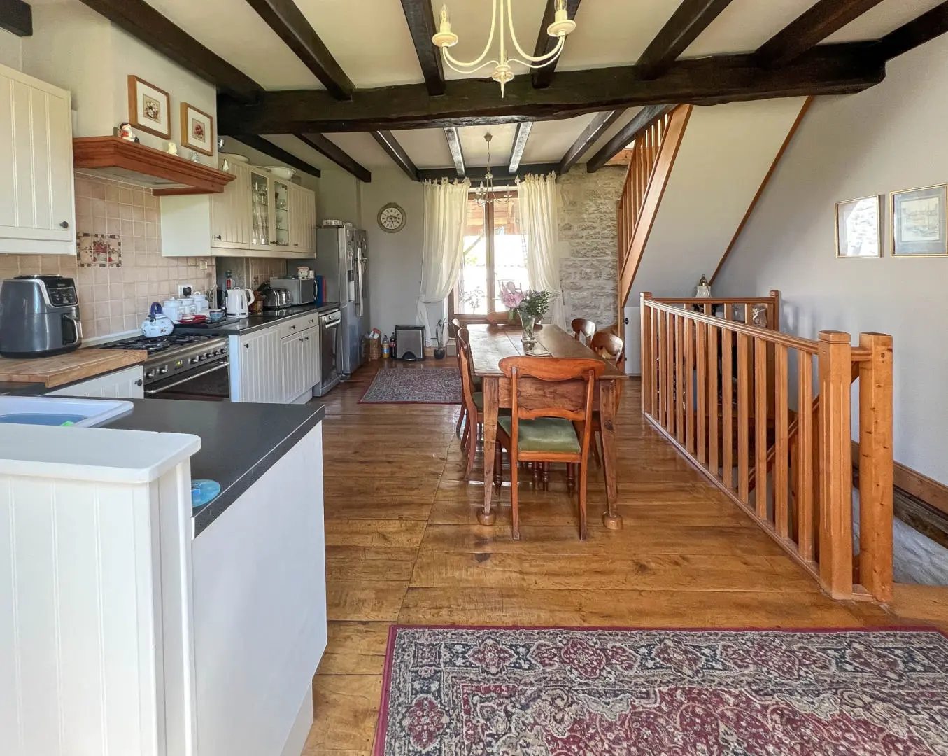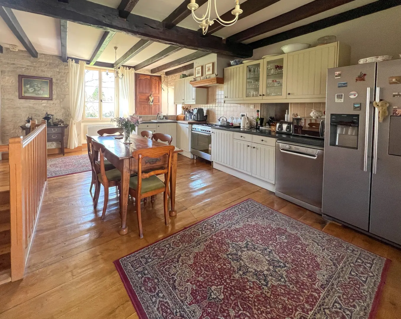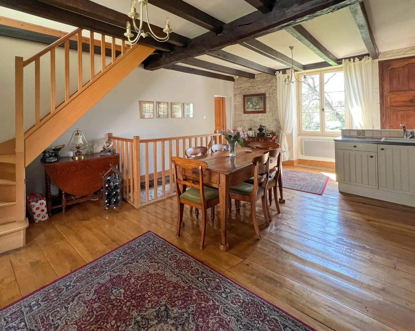 Kitchen: 24.50 m² – Wood floors, revealed stone, beams, French door opening onto the covered terrace