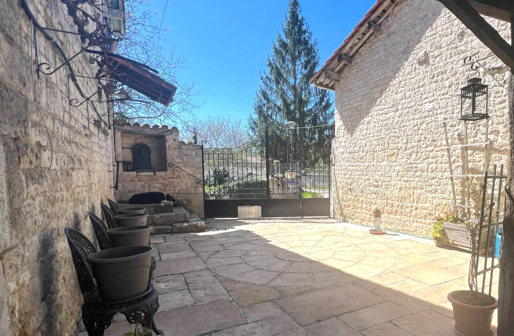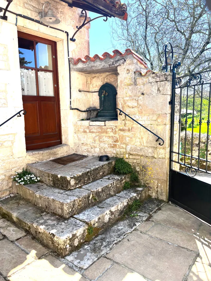 Be quick, great find. Traditional old golden stone detached character village residence, with views of the local church. Featuring revealed stone walls, oak beams, authentic feature stone fireplace. Lovely sunny tiled courtyard with workshop art studio. Covered built-in jacuzzi and shaded outside decked out dining area, with access to the country kitchen 28 m². Perfect for relaxing on those long summer days. The property sets on three levels is very well presented. Including three bedrooms good sized, 2 bathrooms and country style kitchen. This would make a great main residence or an easily managed second home with rental potential.