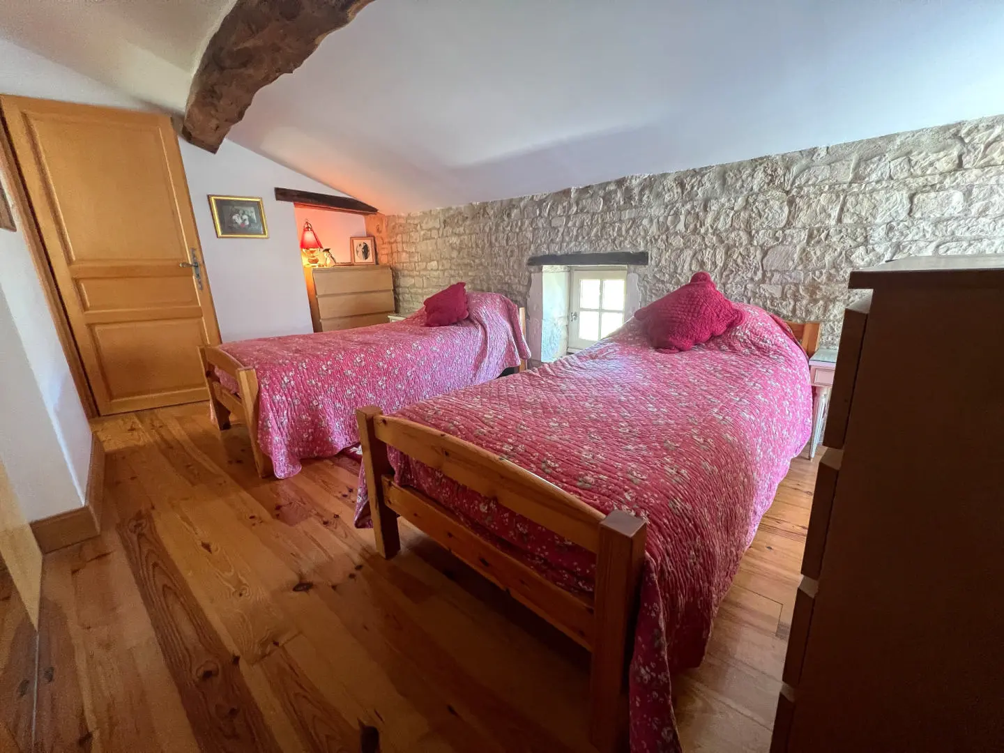 Bedroom 3: 13.5 m² – Wooden floor, exposed stone