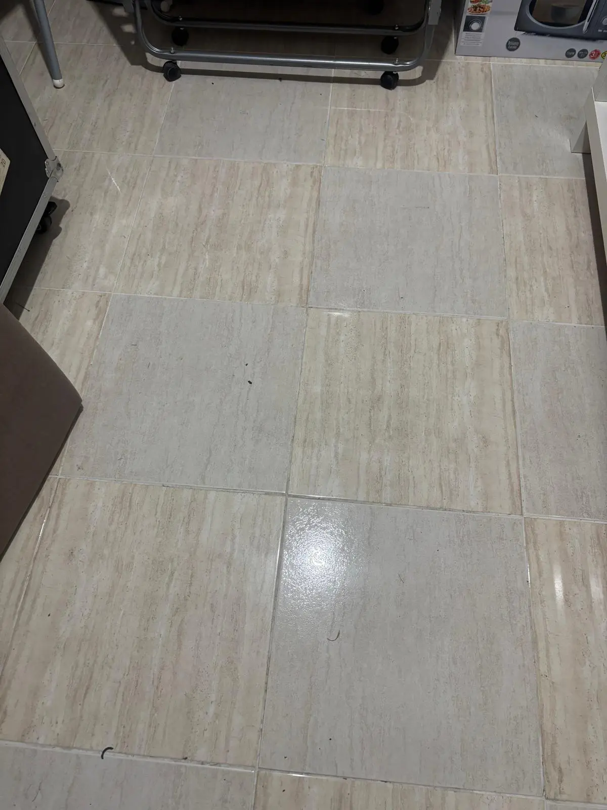 The flooring is made of durable ceramic tiles, and there is electrical connection available within the unit.